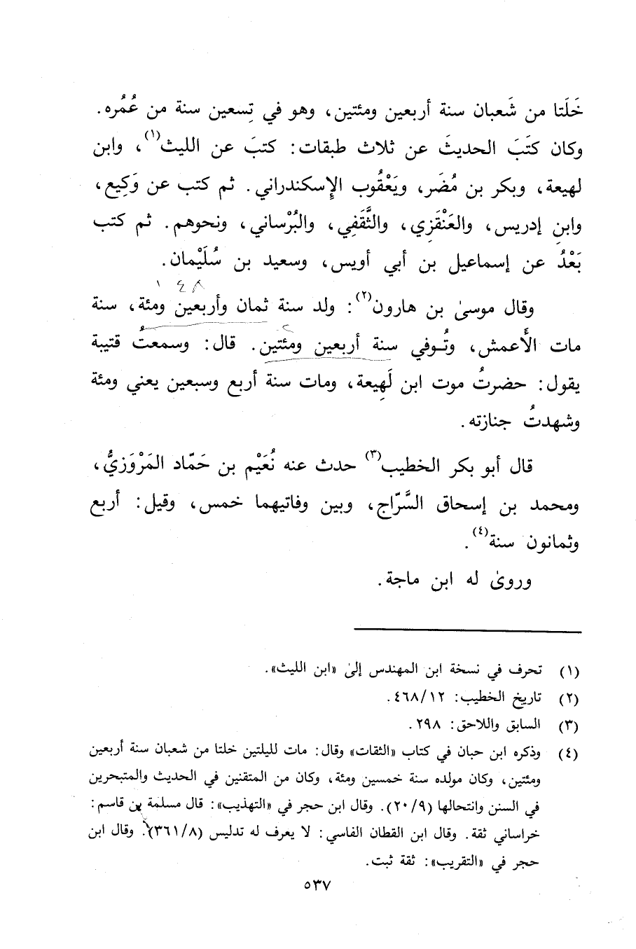(4) وذكره ابنُ حِبَّان في كتاب "الثقات" وَقَال: مات لليلتين خلتا من شعبان سنة أربعين ومئتين، وكان مولده سنة خمسين ومئة، وكان من المتقنين في الحديث والمتبحرين في السنن وانتحالها (9 / 20) . وَقَال ابن حجر في "التهذيب ": قال مسلمة بن قاسم: خراساني ثقة. وَقَال ابن القطان الفاسي: لايعرف له تدليس (8 / 361) . وَقَال ابن حجر في "التقريب": ثقة ثبت.