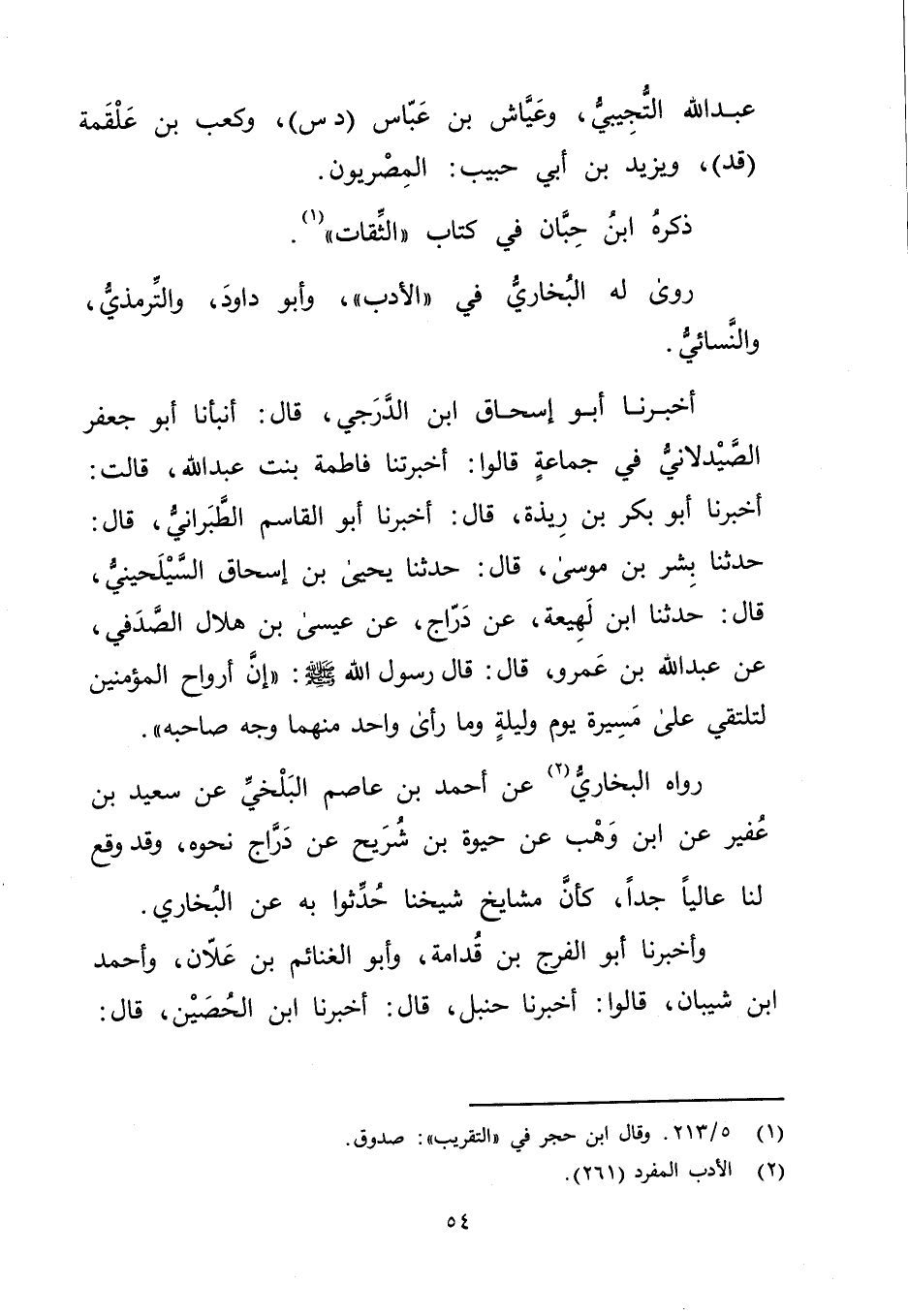 أَخْبَرَنَا أَبُو إِسْحَاقَ ابْنُ الدَّرَجِيِّ، قال: أَنْبَأَنَا أَبُو جَعْفَرٍ الصَّيْدَلانِيُّ فِي جَمَاعَةٍ قَالُوا: أَخْبَرَتْنا فَاطِمَةُ بِنْتُ عَبد اللَّهِ، قَالَتْ: أخبرنا أَبُو بَكْرِ بْنُ رِيذَةَ، قال: أخبرنا أَبُو الْقَاسِمِ الطَّبَرَانِيُّ، قال: حَدَّثَنَا بِشْرُ بْنُ مُوسَى، قال: حَدَّثَنَا يَحْيَى بْنُ إِسْحَاقَ السَّيْلَحِينِيُّ، قال: حَدَّثَنَا ابْنُ لَهِيعَة، عَنْ دَرَّاجٍ، عَنْ عِيسَى بْن هِلالٍ الصَّدَفِيِّ، عَنْ عَبد اللَّهِ بْنِ عَمْرو، قال: قال رَسُول اللَّهِ صلى الله عليه وسَلَّمَ: (إِنَّ أَرْوَاحَ الْمُؤْمِنِينَ لَتَلْتَقِي عَلَى مَسِيرَةِ يَوْمٍ ولَيْلَةٍ ومَا رَأَى واحِدٌ مِنْهُمَا وجْهَ صَاحِبِهِ) .