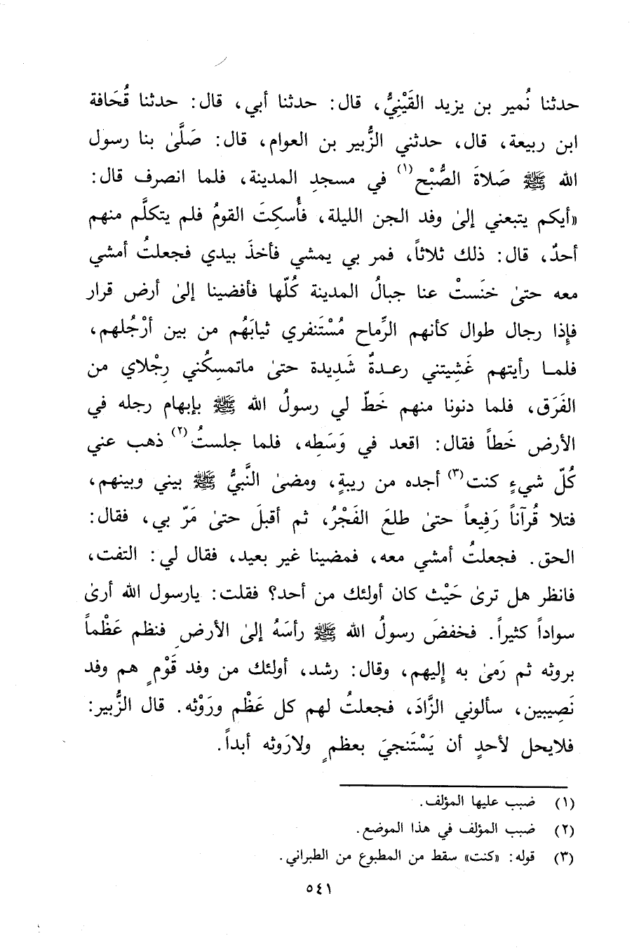حَدَّثَنَا نُمَيْرُ بْنُ يَزِيدَ الْقَيْنِيُّ، قال: حَدَّثَنَا أَبِي، قال: حَدَّثَنَا قحافة ابن رَبِيعَةَ، قال: حَدَّثَنِي الزُّبَيْرُ بْنُ الْعَوَّامِ، قال: صَلَّى بِنَا رَسُولُ اللَّهِ صلى الله عليه وسلم صَلاةَ الصُّبْحِ (1) فِي مَسْجِدِ الْمَدِينَةِ، فَلَمَّا انْصَرَفَ قال: أَيُّكُمْ يَتَّبِعُنِي إِلَى وفْدِ الْجِنِّ اللَّيْلَةَ، فَأَسْكَتَ الْقَوْمُ فَلَمْ يَتَكَلَّمْ مِنْهُمْ أَحَدٌ، قال: ذَلِكَ ثَلاثًا، فَمَرَّ بِي يَمْشِي فَأَخَذَ بِيَدِي فَجَعَلْتُ أَمْشِي مَعَهُ حَتَّى خَنَسَتْ عَنَّا جِبَالُ الْمَدِينَةِ كُلُّهَا فَأَفْضَيْنَا إِلَى أَرْضِ قَرَارٍ فَإِذَا رِجَالٌ طُوَالٌ كَأَنَّهُمُ الرِّمَاحُ مُسْتَنْفِرِي ثَيَابَهُمْ مِنْ بَيْنَ أَرْجُلِهِمْ، فَلَمَّا رَأَيْتُهُمْ غَشِيَتْنِي رِعْدَةٌ شَدِيدَةٌ حَتَّى مَا تَمْسِكْنِي رِجْلاي مِنَ الْفَرَقِ، فَلَمَّا دَنَوْنَا مِنْهُمْ خَطَّ لِي رَسُولُ اللَّهِ صَلَّى اللَّهُ عَلَيْهِ وسَلَّمَ بِإِبْهَامِ رِجْلِهِ فِي الأَرْضِ خَطًّا فَقَالَ: اقْعُدْ فِي وسَطِهِ، فَلَمَّا جَلَسْتُ (2) ذَهَبَ عَنِّي كُلُّ شَيْءٍ كُنْتُ (3) أَجِدُهُ مِنْ رِيبَةٍ، ومَضَى النَّبِيُّ صَلَّى اللَّهُ عَلَيْهِ وسَلَّمَ بَيْنِي وبَيْنَهُمْ، فَتَلا قُرْآنًا رَفِيعًا حَتَّى طَلَعَ الفجر، ثم أقبل حتى مربي، فَقَالَ: الْحِقْ. فَجَعَلْتُ أَمْشِي مَعَهُ، فَمَضَيْنَا غَيْرَ بَعِيدٍ، فَقَالَ لِي: الْتَفِتْ، فَانْظُرْ هَلْ تَرَى حَيْثُ كَانَ أُولَئِكَ مِنْ أَحَدٍ؟ فَقُلْتُ: يَا رَسُولَ اللَّهِ أَرَى سَوَادًا كَثِيرًا. فَخَفَضَ رَسُولُ اللَّهِ صَلَّى اللَّهُ عَلَيْهِ وسَلَّمَ رَأْسَهُ إِلَى الأَرْضِ فَنَظَمَ عَظْمًا بِرَوْثِهِ ثُمَّ رَمَى بِهِ إِلَيْهِمْ، وَقَال: رَشَدَ، أُولَئِكَ مِنْ وفْدِ قَوْمٍ هُمْ وفْدُ نَصِيبَيْنِ، سَأَلُونِي الزَّادَ، فَجَعَلْتُ لَهُمْ كُلَّ عَظْمٍ ورَوْثَهُ. قال الزُّبَيْرُ: فَلا يَحِلُّ لأَحَدٍ أَنْ يستنجي بعظم ولاروثه أبدا.