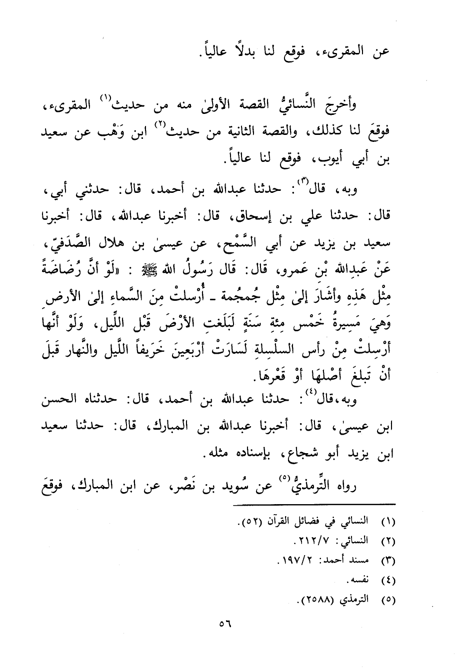 وبه، قال (3) : حَدَّثَنَا عَبد اللَّهِ بْن أَحْمَدَ، قال: حَدَّثني أَبِي، قال: حَدَّثَنَا عَلِيُّ بْنُ إسحاق، قال: أَخْبَرَنَا عَبد اللَّه، قال: أَخْبَرَنَا سَعِيد بْنُ يَزِيدَ عَن أَبِي السَّمْحِ، عَنْ عِيسَى بْن هِلالٍ الصَّدَفِيِّ، عَنْ عَبد اللَّهِ بْنِ عَمْرو، قال: قال رَسُول اللَّهِ صلى الله عليه وسَلَّمَ: لَوْ أَنَّ رُضَاضَةً مِثْلُ هَذِهِ وأَشَارَ إِلَى مِثَلِ جُمْجُمَةٍ - أُرْسِلَتْ مِنَ السَّمَاءِ إِلَى الأَرْضِ وهي مسيرة خمس مئة سَنَةٍ لَبَلَغَتِ الأَرْضَ قَبْلَ اللَّيْلِ، ولَوْ أَنَّهَا أُرْسِلَتْ مِنْ رَأْسِ السلة لَسَارَتْ أَرْبَعِينَ خَرِيفًا اللَّيْلَ والنَّهَارَ قَبْلَ أَنْ تَبْلُغَ أَصْلَهَا أَوْ قَعْرَهَا.