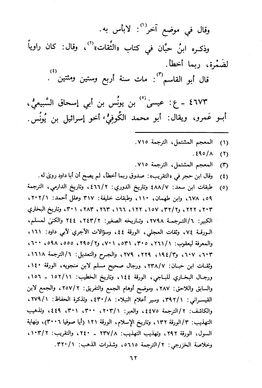 4673 - ع: عِيسَى بن يونس بن أَبي إسحاق السبيعي (5) ، أَبُو عَمْرو، ويُقال: أَبُو مُحَمَّد الكوفي، أخو إسرائيل بن يونس.