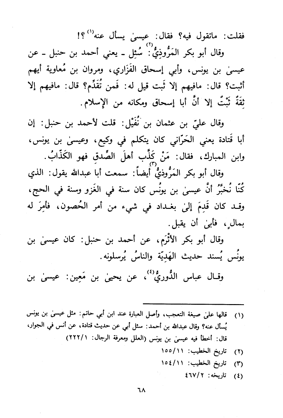 (1) قالها على صيغة التعجب، وأصل العبارة عند ابن أَبي حاتم: مثل عيسى بن يونس يسأل عَنه؟ وَقَال عَبد الله بْن أحمد: سئل أبي عن حديث قتادة، عَنْ أنس في الجوار، قال: أخطأ فيه عيسى بن يونس (العلل ومعرفة الرجال: 1 / 222) .