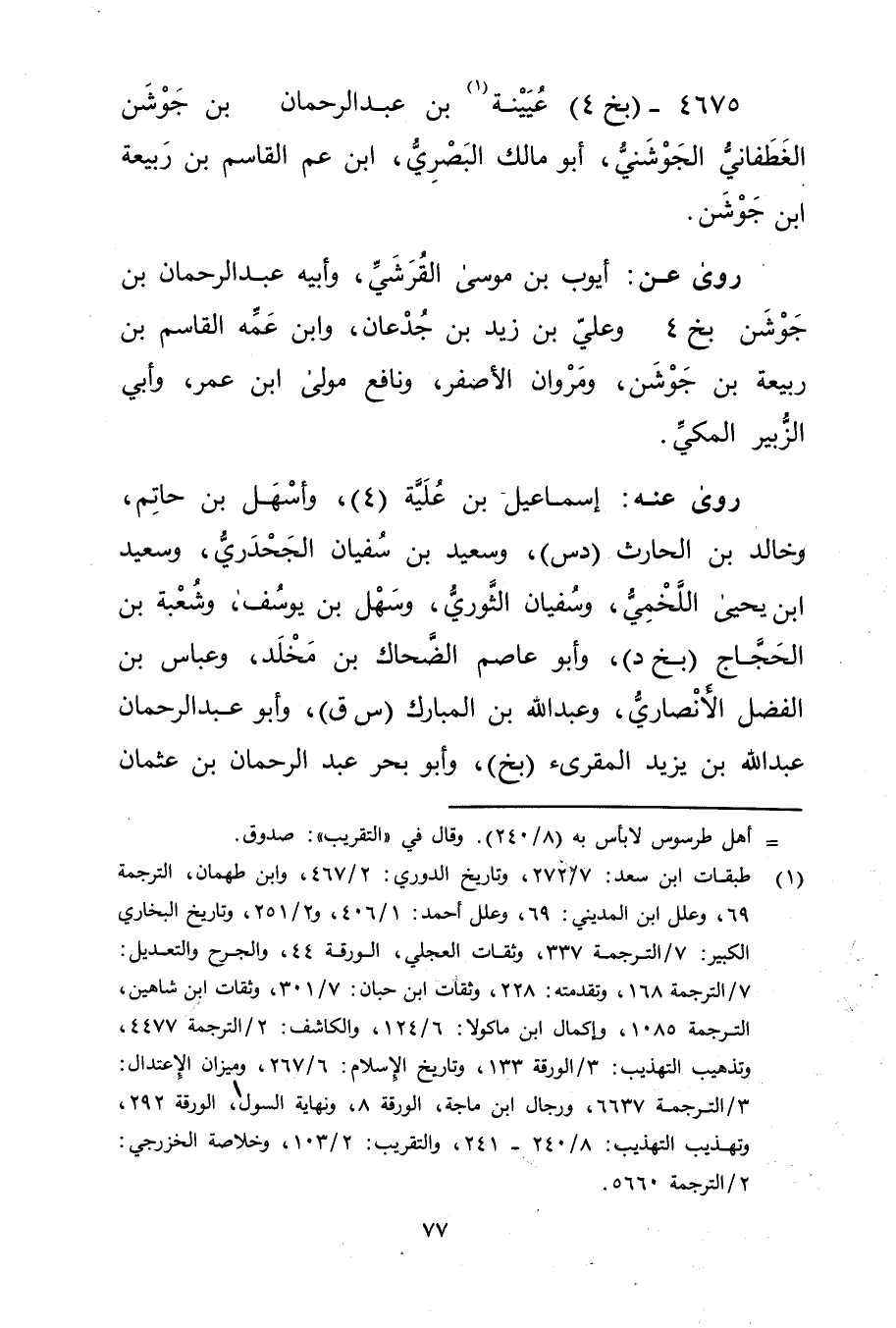 4675 - (بخ 4) عُيَيْنَة بن عَبْد الرَّحْمَنِ بن جوشن الغطفاني الجوشني (1) ، أَبُو مالك البَصْرِيّ، ابن عم القاسم بن ربيعة ابن جوشن.