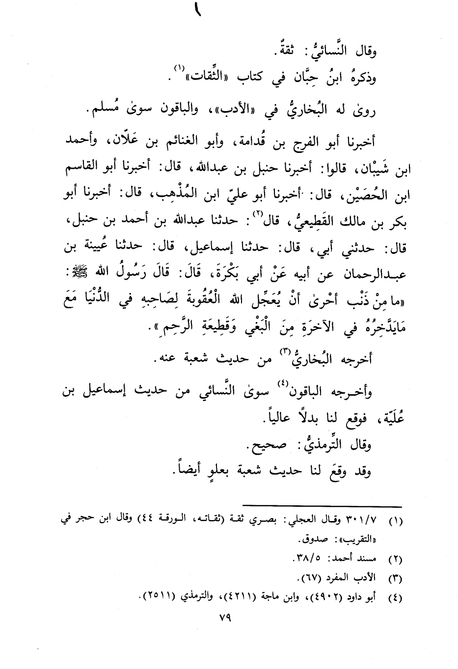 أَخْبَرَنَا أَبُو الفرج بْنُ قُدَامَةَ، وأَبُو الْغَنَائِمِ بْنُ عَلانَ، وأَحْمَدُ بْنُ شَيْبَانَ، قَالُوا: أَخْبَرَنَا حنبل بْن عَبد الله، قال: أَخْبَرَنَا أَبُو الْقَاسِمِ ابْنُ الحصين، قال: أَخْبَرَنَا أبو علي ابْنُ الْمُذْهِب، قال: أَخْبَرَنَا أَبُو بكر بْن مالك القَطِيعِيّ، قال (2) : حَدَّثَنَا عَبد اللَّهِ بْنُ أَحْمَدَ بْن حنبل، قال: حَدَّثني أبي، قال: حَدَّثَنَا إِسْمَاعِيلُ، قال: حَدَّثَنَا عُيَيْنَة بْنُ عَبْدِ الرَّحْمَنِ عَن أَبِيهِ عَن أَبِي بَكْرَةَ، قال: قال رَسُولُ اللَّهِ صلى الله عَلَيْهِ وسَلَّمَ: (مَا مِنْ ذَنْبٍ أَحْرَى أَنْ يُعَجِّلَ اللَّهُ الْعُقُوبَةَ لِصَاحِبِهِ فِي الدُّنْيَا مَعَ مَا يَدَّخِرُهُ فِي الآخِرَةِ مِنَ الْبَغْيِ وقَطِيعَةِ الرَّحِمِ) .