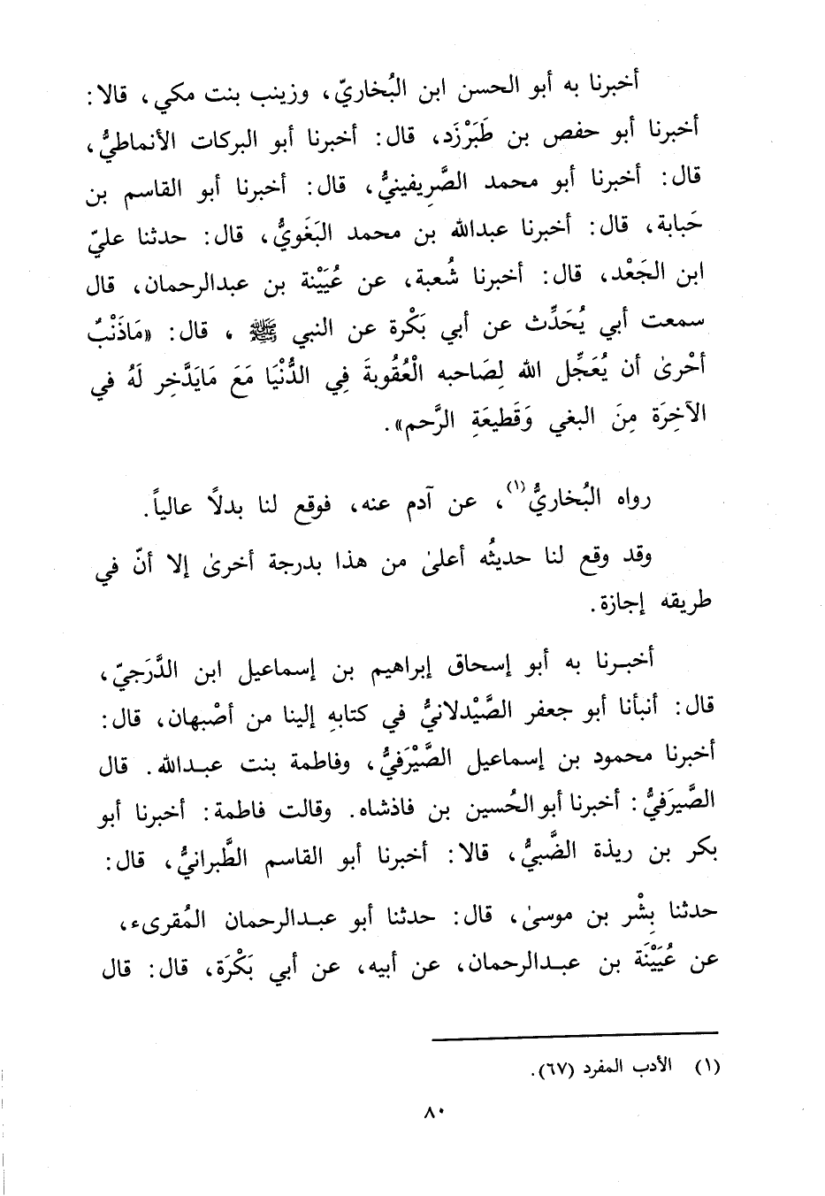 أخبرنا بِهِ أَبُو الْحَسَنِ بْنُ البخاري، وزينب بنت مكي، قَالا: أخبرنا أبو حفص بن طَبَرْزَذَ، قال: أَخْبَرَنَا أَبُو الْبَرَكَاتِ الأَنْمَاطِيُّ، قال: أخبرنا أَبُو مُحَمَّدٍ الصَّرِيفِينِيُّ، قال: أَخْبَرَنَا أبو القاسم بْن حُبَابَةَ، قال: أَخْبَرَنَا عَبد اللَّهِ بْنُ مُحَمَّدٍ الْبَغَوِيُّ، قال: حَدَّثَنَا علي ابن الْجَعْدِ، قال: أَخْبَرَنَا شُعْبَةُ، عَنْ عُيَيْنَة بْنِ عَبْدِ الرَّحْمَنِ، قال سَمِعْتُ أَبِي يحدث عَن أَبِي بَكْرَةَ عَنِ النَّبِيِّ صَلَّى اللَّهُ عَلَيْهِ وسَلَّمَ، قال: (مَا ذَنْبٌ أَحْرَى أَنْ يُعَجِّلَ اللَّهُ لِصَاحِبِهِ الْعُقُوبَةَ فِي الدُّنْيَا مَعَ مَا يُدَّخَرُ لَهُ فِي الآخِرَةِ مِنَ الْبَغْيِ وقَطِيعَةِ الرَّحِمِ) .