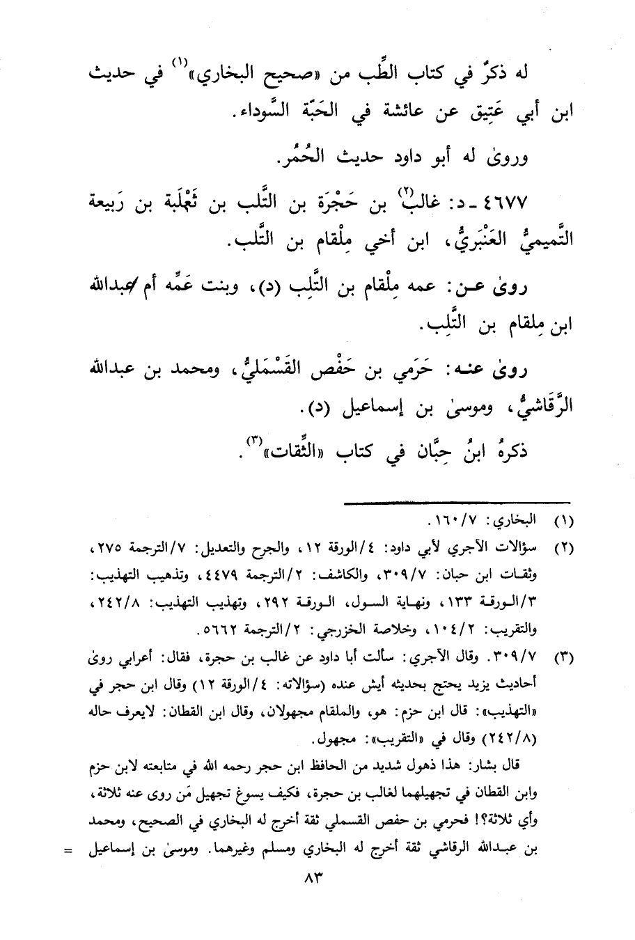 (3) 7 / 309. وَقَال الآجُرِّيّ: سألت أبا داود عن غالب بن حجرة، فقال: أعرابي روى أحاديث يزيد يحتج بحديثه أيش عنده (سؤالاته: 4 / الورقة 12) وَقَال ابن حجر في (التهذيب) : قال ابن حزم: هو، والملقام مجهولان، وَقَال ابن القطان: لا يعرف حاله (8 / 242) وَقَال في (التقريب) : مجهول. قال بشار: هذا ذهول شديد من الحافظ ابن حجر رحمه الله في متابعته لابن حزم وابن القطان في تجهيلهما لغالب بن حجرة، فكيف يسوغ تجهيل من روى عنه ثلاثة، وأي ثلاثة؟ ! فحرمي بن حفص القسملي ثقة أخرج له البخاري في الصحيح، ومحمد بن عَبد الله الرقاشي ثقة أخرج له البخاري ومسلم وغيرهما. وموسى بن إسماعيل =