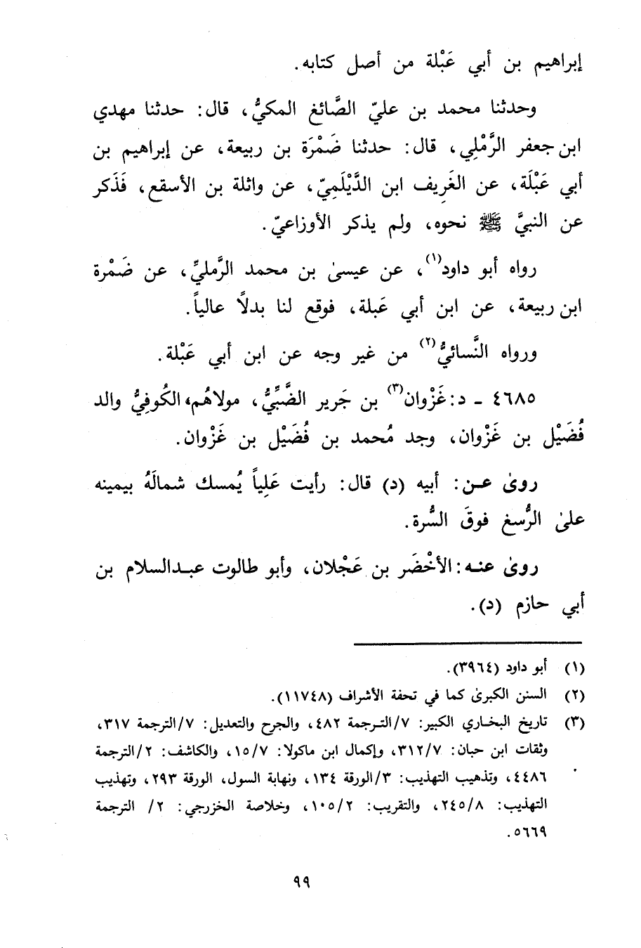 روى عن: أبيه (د) قال: رأيت عليا يمسك شماله بيمينه على الرسغ فوق السرة.