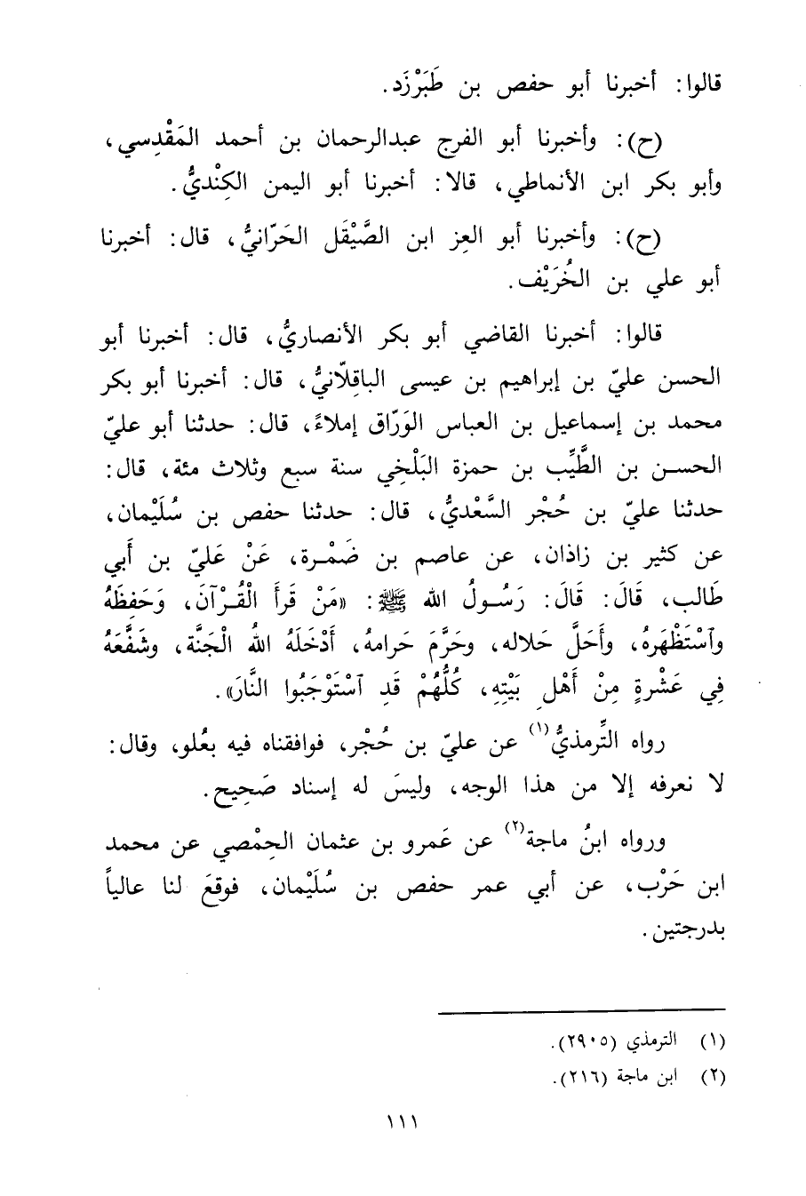 (ح) : وأَخْبَرَنَا أبو العز ابن الصيقل الحراني، قال: أَخْبَرَنَا أَبُو علي بْن الخريف. قَالُوا: أخبرنا الْقَاضِي أَبُو بكر الأَنْصارِيّ، قال: أَخْبَرَنَا أَبُو الْحَسَنِ عَلِيُّ بْنُ إِبْرَاهِيم بْن عيسى الباقلاني، قال: أَخْبَرَنَا أَبُو بَكْرٍ مُحَمَّدُ بْنُ إِسْمَاعِيلَ بْنِ الْعَبَّاسِ الْوَرَّاقُ إِمْلاءً، قال: حَدَّثَنَا أَبُو علي الحسن بْن الطيب بْن حَمْزَة البلخي سنة سبع وثلاث مئة، قال: حَدَّثَنَا عَلِيُّ بْنُ حُجْرٍ السَّعْدِيُّ، قال: حَدَّثَنَا حَفْصُ بْنُ سُلَيْمان، عَنْ كَثِيرِ بْنِ زَاذَانَ، عَنْ عَاصِمِ بْنِ ضَمْرَةَ، عَنْ عَلِيّ بْن أَبي طالب، قال: قال: رَسُولُ اللَّهِ صلى الله عليه وسلم: "مَنْ قَرَأَ الْقُرْآنَ، وحَفِظَهُ واسْتَظْهَرَهُ، وأَحَلَّ حَلالَهُ، وحَرَّمَ حَرَامَهُ، أَدْخَلَهُ اللَّهُ الْجَنَّةَ، وشَفَّعَهُ فِي عَشَرَةٍ مِنْ أَهْلِ بَيْتِهِ، كُلُّهُمْ قَدِ اسْتَوْجَبُوا النَّارَ.