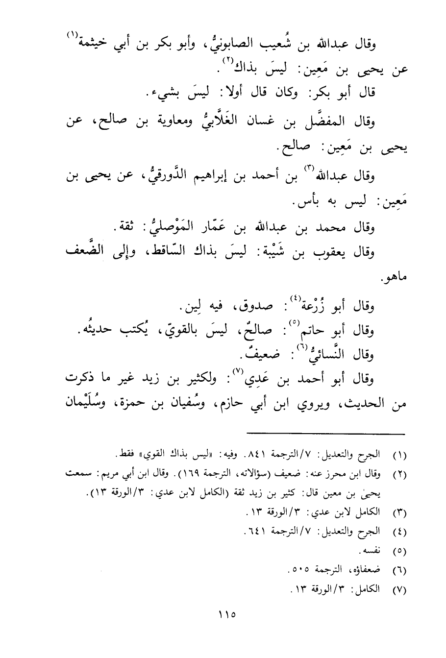 (2) وَقَال ابن محرز عَنه: ضعيف (سؤالاته، الترجمة 169) . وَقَال ابن أَبي مريم: سمعت يحيى بْن مَعِين قال: كثير بن زيد ثقة (الكامل لابن عدي: 3 / الورقة 13) .