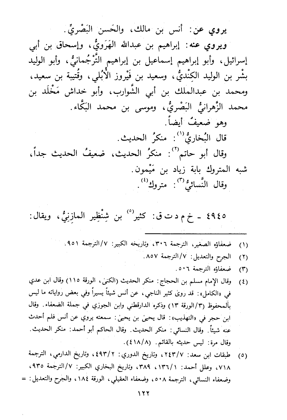 (4) وَقَال الإمام مسلم بْن الحجاج: منكر الحديث (الكنى، الورقة 115) وَقَال ابن عدي في "الكامل ": قد روى كثير الناجي، عن أنس شيئا يسيرا وفي بعض رواياته ما ليس بالمحفوظ (3 / الورقة 13) وذكره الدَّارَقُطنِيّ وابن الجوزي في جملة الضعفاء. وَقَال ابن حجر في "التهذيب ": قال يحيى بن يحيى: سمعته يروي عن أنس فلم أحدث عنه شيئا. وَقَال النَّسَائي: منكر الحديث. وَقَال الحاكم أبو أحمد: منكر الحديث. وَقَال مرة: ليس حديثه بالقائم.