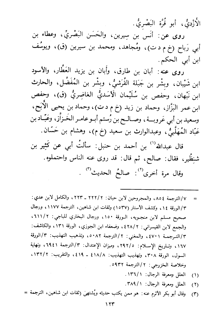 = 7 / الترجمة 854، والمجروحين لابن حبان: 2 / 222 - 223، والكامل لابن عدي: 3 / الورقة 14، وكشف الاستار (1537) وثقات ابن شاهين، والترجمة 1177، ورجال صحيح مسلم لابن منجويه، الورقة 150، ورجال البخاري للباجي: 2 / 611، والجمع لابن القيسراني: 2 / 428، وضعفاء ابن الجوزي، الورقة 131، والكاشف: 3 / الترجمة 4701، والمغني: 2 / الترجمة 5082، وتذهيب التهذيب: 3 / الورقة 167، وتاريخ الاسلام: 5 / 292، وميزان الاعتدال: 3 / الترجمة 6941، ونهاية السول، الورقة 308، وتهذيب التهذيب: 8 / 418 - 419، والتقريب: 2 / 132، وخلاصة الخزرجي: 2 / الترجمة 5932.