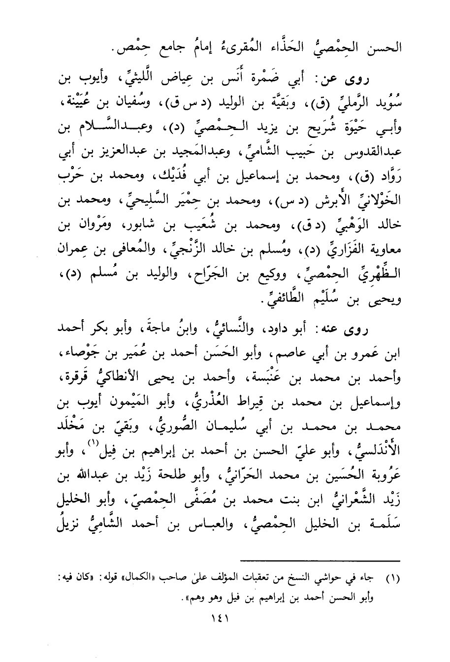 الْحَسَن الحمصي الحذاء المقرئ إمام جامع حمص.