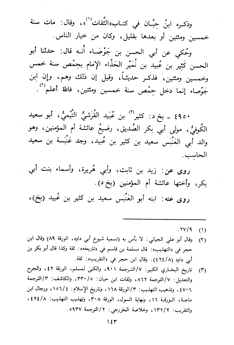 4950 - بخ د: كَثِير بن عُبَيد الْقُرَشِيّ التَّيْمِيّ (3) ، أَبُو سَعِيد الكوفي، مولى أَبِي بَكْر الصديق، رضيع عائشة أم المؤمنين، وهُوَ والد أَبِي العنبس سَعِيد بْن كَثِير بْن عُبَيد، وجد عنبسة بْن سَعِيد الحاسب.