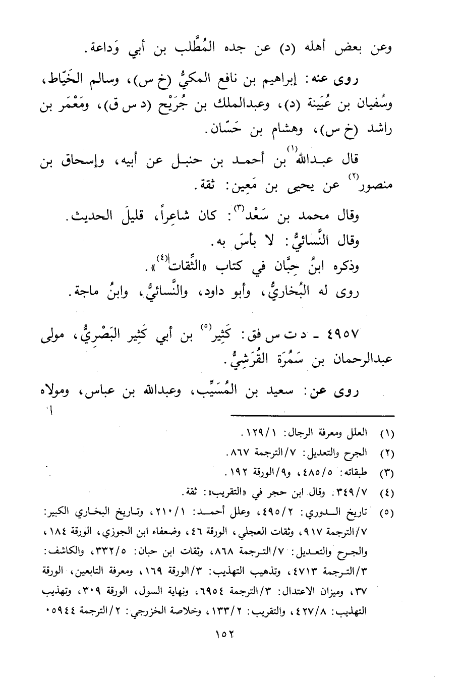 (5) تاريخ الدوري: 2 / 495، وعلل أحمد: 1 / 210، وتاريخ البخاري الكبير: 7 / الترجمة 917، وثقات العجلي، الورقة 46، وضعفاء ابن الجوزي، الورقة 184، والجرح والتعديل: 7 / الترجمة 868، وثقات ابن حبان: 5 / 332، والكاشف: 3 / الترجمة 4713، وتذهيب التهذيب: 3 / الورقة 169، ومعرفة التابعين، الورقة 37، وميزان الاعتدال: 3 / الترجمة 6954، ونهاية السول، المعرفة 309، وتهذيب التهذيب: 8 / 427، والتقريب: 2 / 133، وخلاصة الخزرجي: 2 / الترجمة 5944.