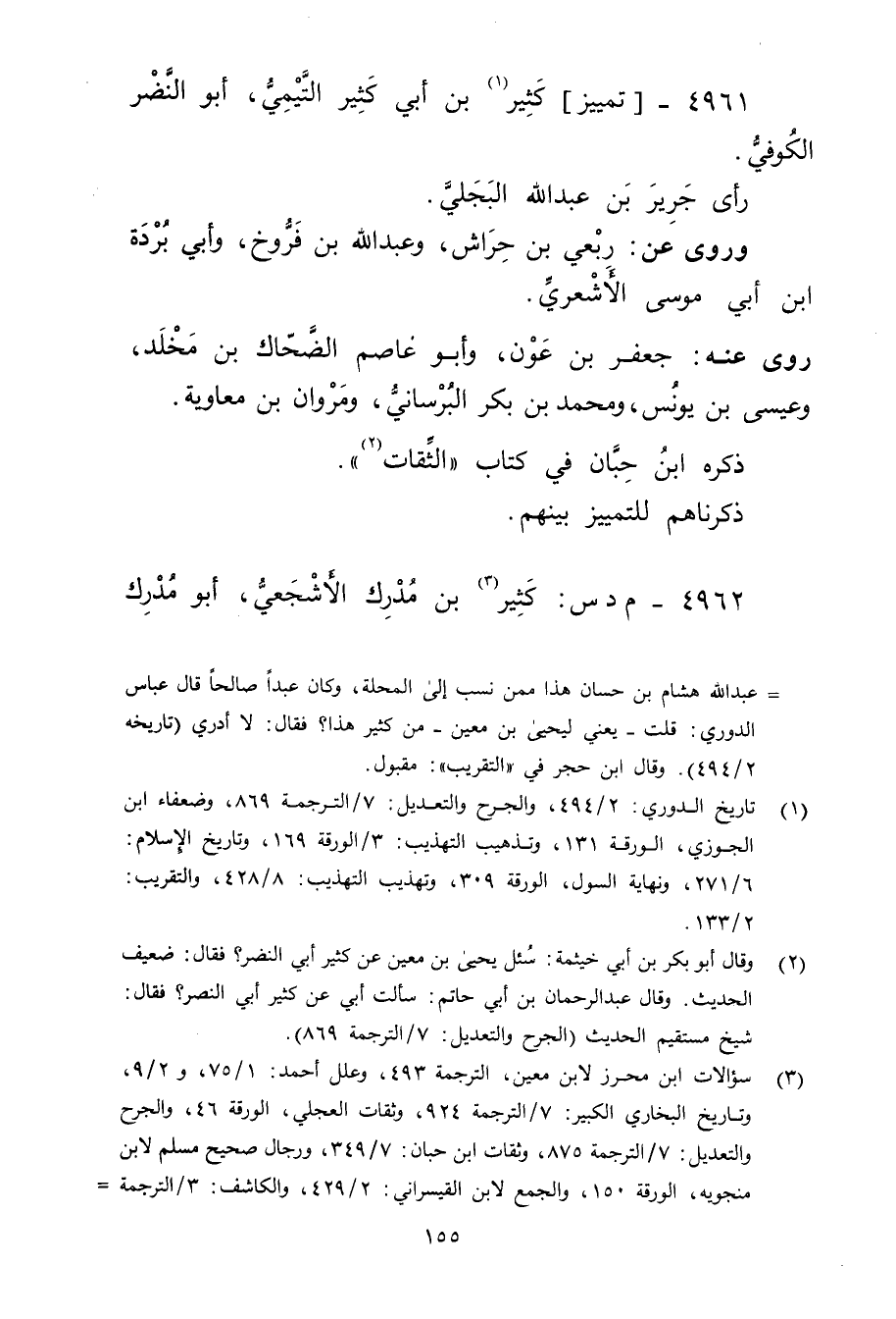 (2) وَقَال أبو بكر أبي خيثمة: سئل يحيى بن مَعِين عن كثير أبي النضر؟ فقال: ضعيف الحديث. وَقَال عبد الرحمن بن أَبي حاتم: سَأَلتُ أبي عن كثير أبي النصر؟ فقال: شيخ مستقيم الحديث (الجرح والتعديل: 7 / الترجمة 869) .