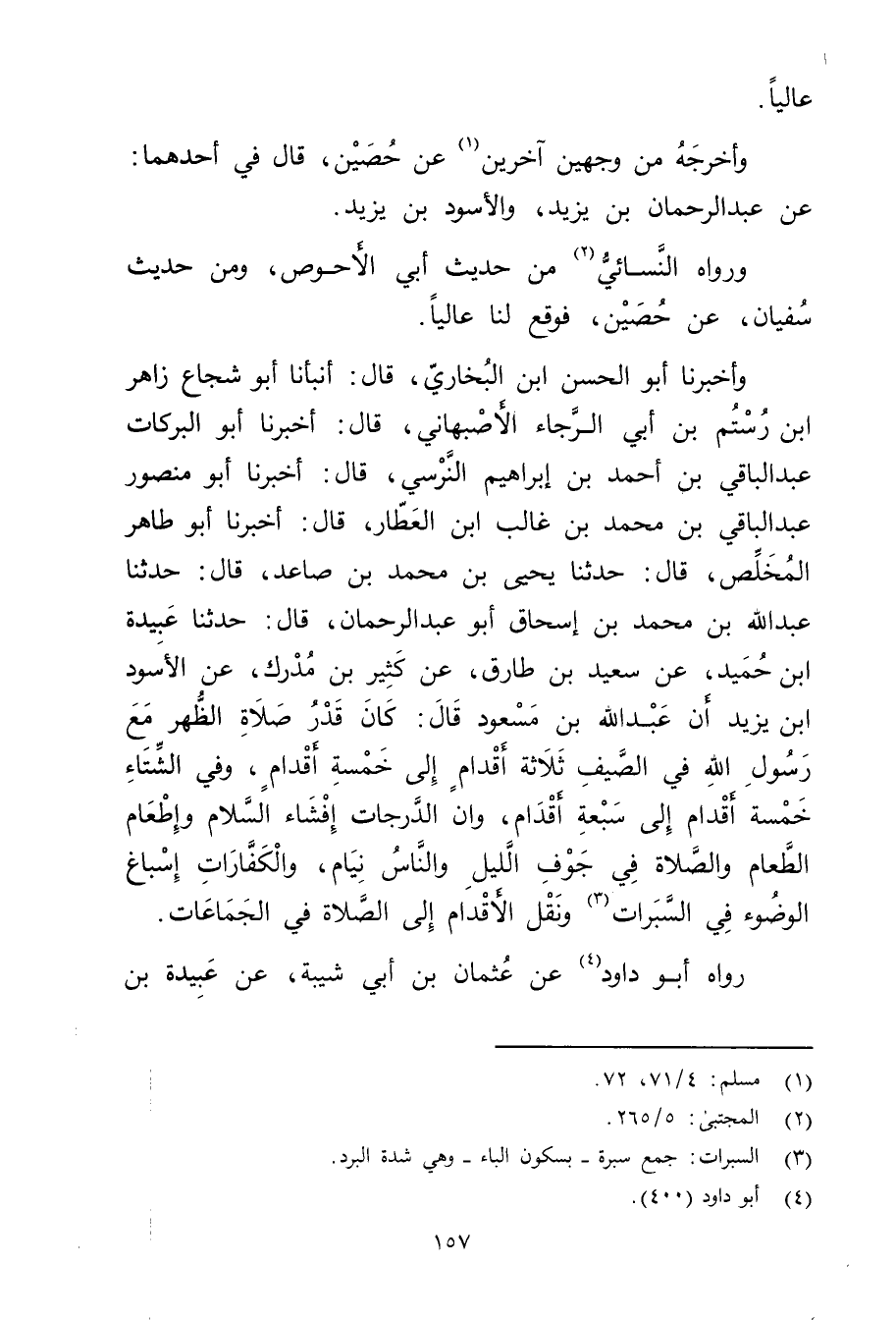 وأخبرنا أَبُو الْحَسَنِ بْنِ الْبُخَارِيِّ، قال: أنبأنا أَبُو شجاع زاهر ابن رُسْتُمَ بْنِ أَبي الرَّجَاءِ الأَصْبَهَانِيُّ، قال: أخبرنا أبو البركات عبدا لباقي بْنُ أَحْمَدَ بْنِ إِبْرَاهِيمَ النَّرْسِيُّ، قال: أخبرنا أبو منصور عبدا لباقي بن محمد بن غالب ابن الْعَطَّارُ، قال: أخبرنا أَبُو طَاهِرٍ الْمُخَلِّصُ، قال: حَدَّثَنَا يحيى بْنُ مُحَمَّد بْن صاعد، قال: حَدَّثَنَا عَبد اللَّهِ بْن مُحَمَّد بْن إِسْحَاقَ أَبُو عَبْدِ الرَّحْمَنِ، قال: حَدَّثَنَا عُبَيدة ابن حُمَيْدٍ، عَنْ سَعِيد بْنِ طَارِقٍ، عَنْ كَثِيرِ بْنِ مُدْرِكٍ، عَنِ الأسود ابن يَزِيدَ أَنَّ عَبد اللَّهِ بْنَ مَسْعُودٍ قال: كَانَ قَدْرُ صَلاةِ الظهر مع رسول الله فِي الصَّيْفِ ثَلاثَةَ أَقْدَامٍ إِلَى خَمْسَةِ أَقْدَامٍ، وفِي الشِّتَاءِ خَمْسَةُ أَقْدَامٍ إِلَى سَبْعَةِ أَقْدَامٍ، وإِنَّ الدَّرَجَاتِ إِفْشَاءُ السَّلامِ وإِطْعَامُ الطَّعَامِ والصَّلاةُ فِي جَوْفِ اللَّيْلِ والنَّاسُ نِيَامٌ، والْكَفَّارَاتُ إِسْبَاغُ الْوُضُوءِ فِي السَّبَرَاتِ (3) ونَقْلِ الأَقْدَامِ إِلَى الصَّلاةِ فِي الْجَمَاعَاتِ.