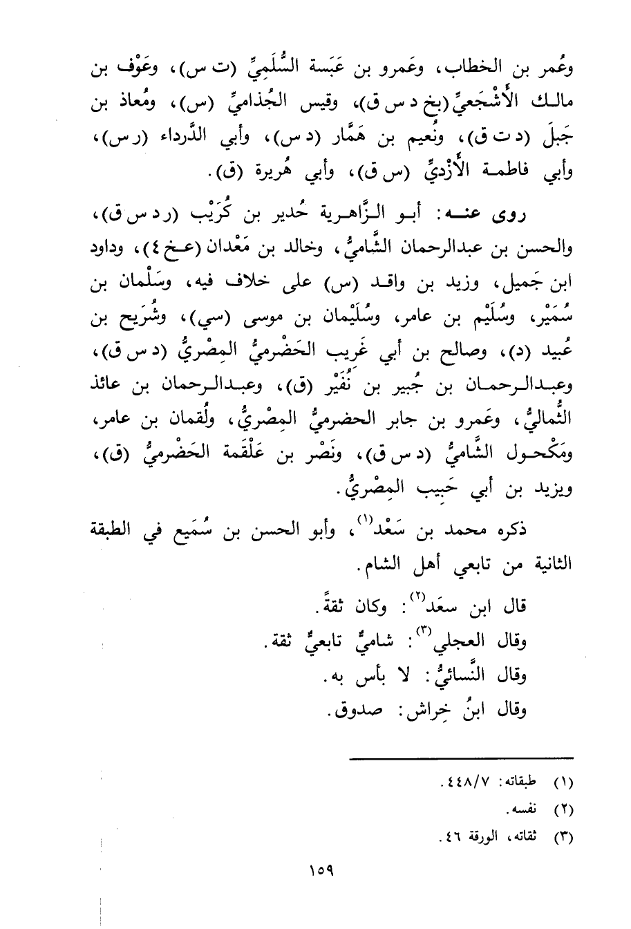 ذكره مُحَمَّد بْن سعد (1) ، وأَبُو الْحَسَنِ بْن سميع فِي الطبقة الثانية من تابعي أهل الشام.