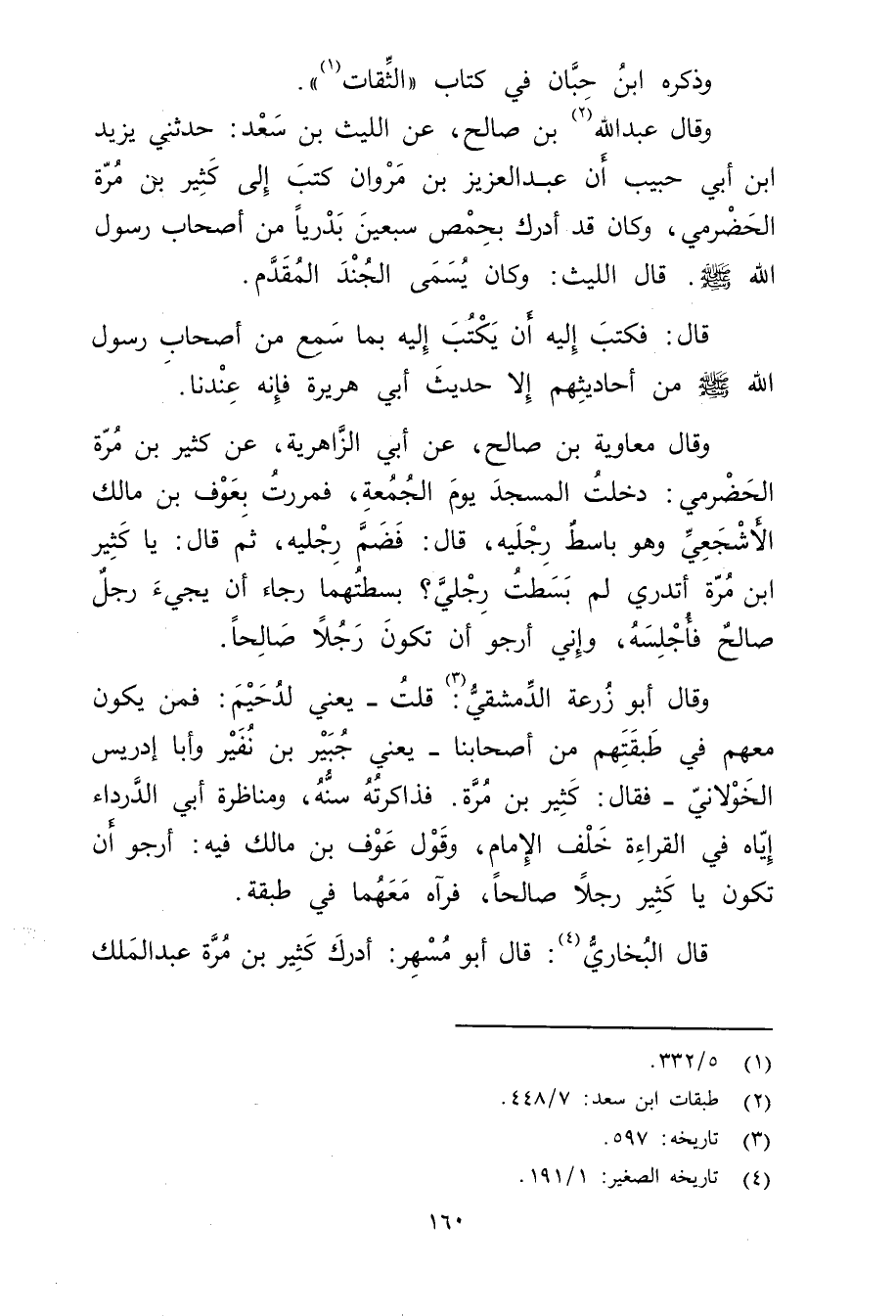 وَقَال عَبد اللَّهِ (2) بْن صَالِح، عَنِ اللَّيْث بْن سَعْد: حدثني يزيد ابن أَبي حبيب أن عبد العزيز بْن مروان كتب إِلَى كَثِير بْن مُرَّةَ الحضرمي، وكان قد أدرك بحمص سبعين بدريا من أصحاب رَسُول اللَّهِ صلى الله عليه وسلم. قال اللَّيْث: وكان يسمى الجند المقدم.