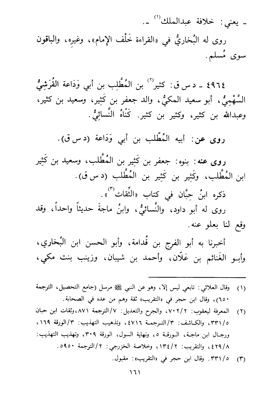 4964 - د س ق: كَثِير بن المطلب بن أَبي وداعة القرشي السهمي (2) ، أَبُو سَعِيد المكي، والد جَعْفَر بْن كَثِير، وسَعِيد بْن كثير، وعَبْد اللَّهِ بْن كثير، وكثير بْن كَثِير.