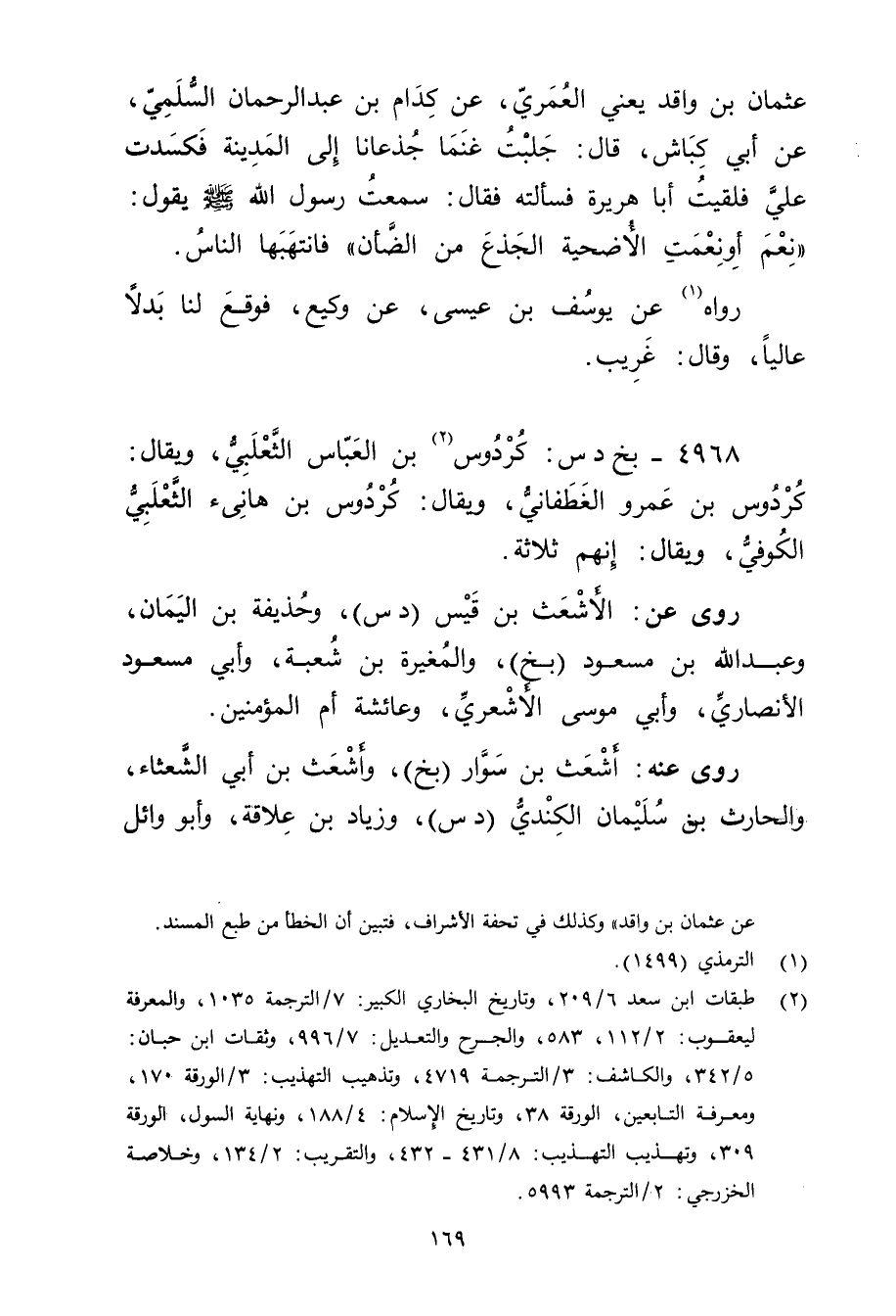 (2) طبقات ابن سعد 6 / 209، وتاريخ البخاري الكبير: 7 / الترجمة 1035، والمعرفة ليعقوب: 2 / 112، 583، والجرح والتعديل: 7 / 996، وثقات ابن حبان: 5 / 342، والكاشف: 3 / الترجمة 4719، وتذهيب التهذيب: 3 / الورقة 170، ومعرفة التابعين، الورقة 38، وتاريخ الاسلام: 4 / 188، ونهاية السول، الورقة 309، وتهذيب التهذيب: 8 / 431 - 432، والتقريب: 2 / 134، وخلاصة الخزرجي: 2 / الترجمة 5993.