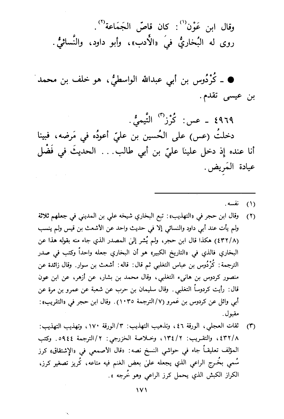 (3) ثقات العجلي، الورقة 46، وتذهيب التهذيب: 3 / الورقة 170، وتهذيب التهذيب: 8 / 432، والتقريب: 2 / 134، وخلاصة الخزرجي: 2 / الترجمة 5944. وكتب المؤلف تعليقا جاء في حواشي النسخ نصه: "قال الأَصْمَعِيّ في "الاشتقاق "كرز سمي بخرج الراعي الذي يجعله على بعض الغنم فيه متاعه، كريز تصغير كرز، الكراز الكبش الذي يحمل كرز الراعي وهو خرجه ".