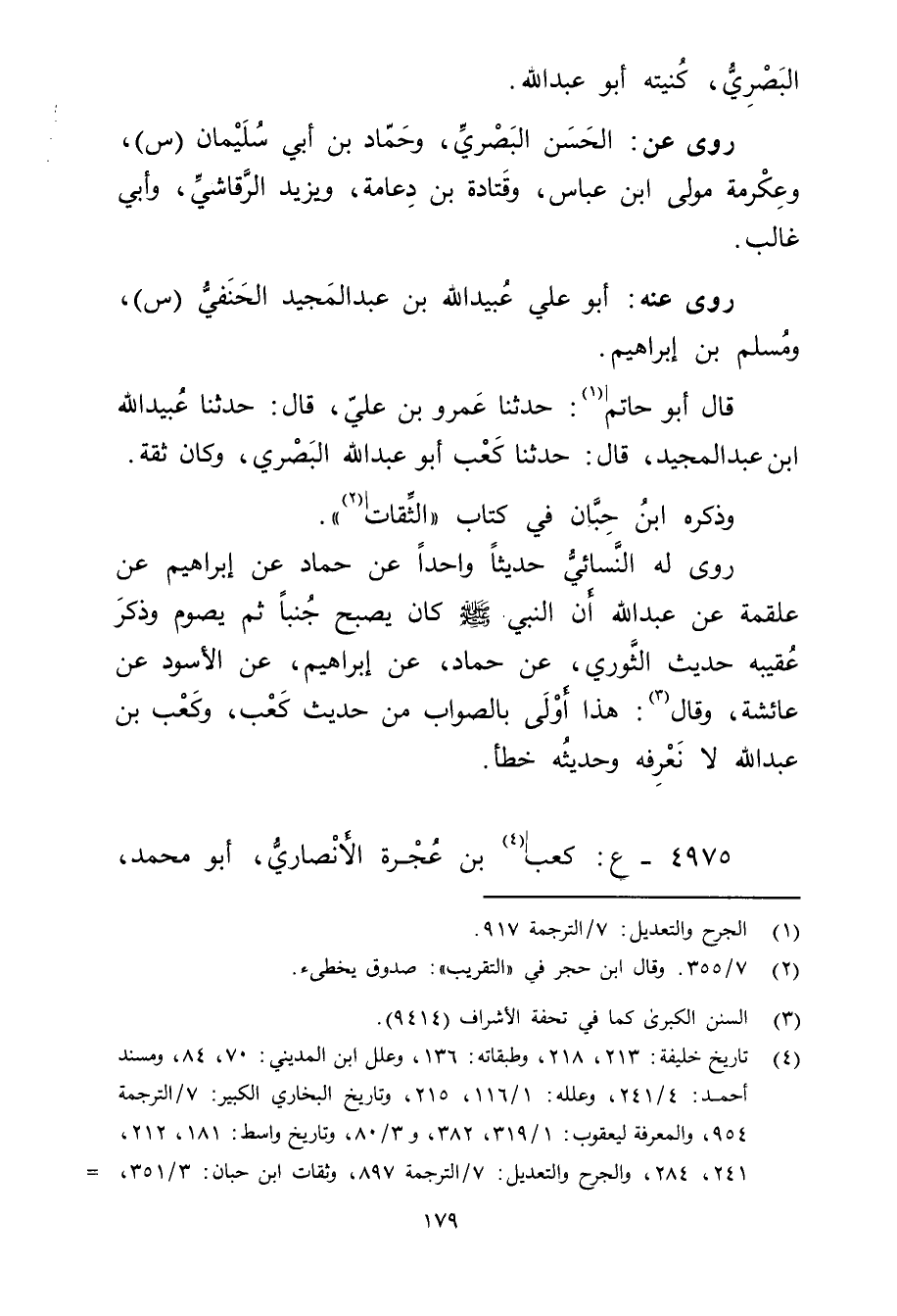 قال أَبُو حاتم (1) : حَدَّثَنَا عَمْرو بْن علي، قال: حَدَّثَنَا عُبَيد اللَّهِ بن عبد الحميد، قال: حَدَّثَنَا كَعْب أَبُو عَبْد اللَّهِ البَصْرِيّ، وكان ثقة.