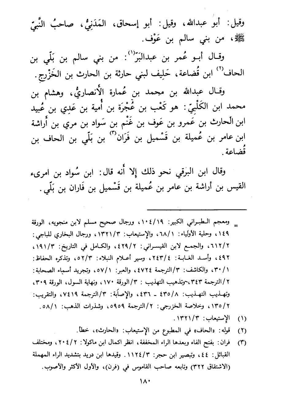 وَقَال أَبُو عُمَر بْن عَبد الْبَرِّ (1) : من بني سالم بْن بلي بن الحاف (2) ابن قضاعة، حليف لبني حارثة بْن الْحَارِث بْن الخزرج.