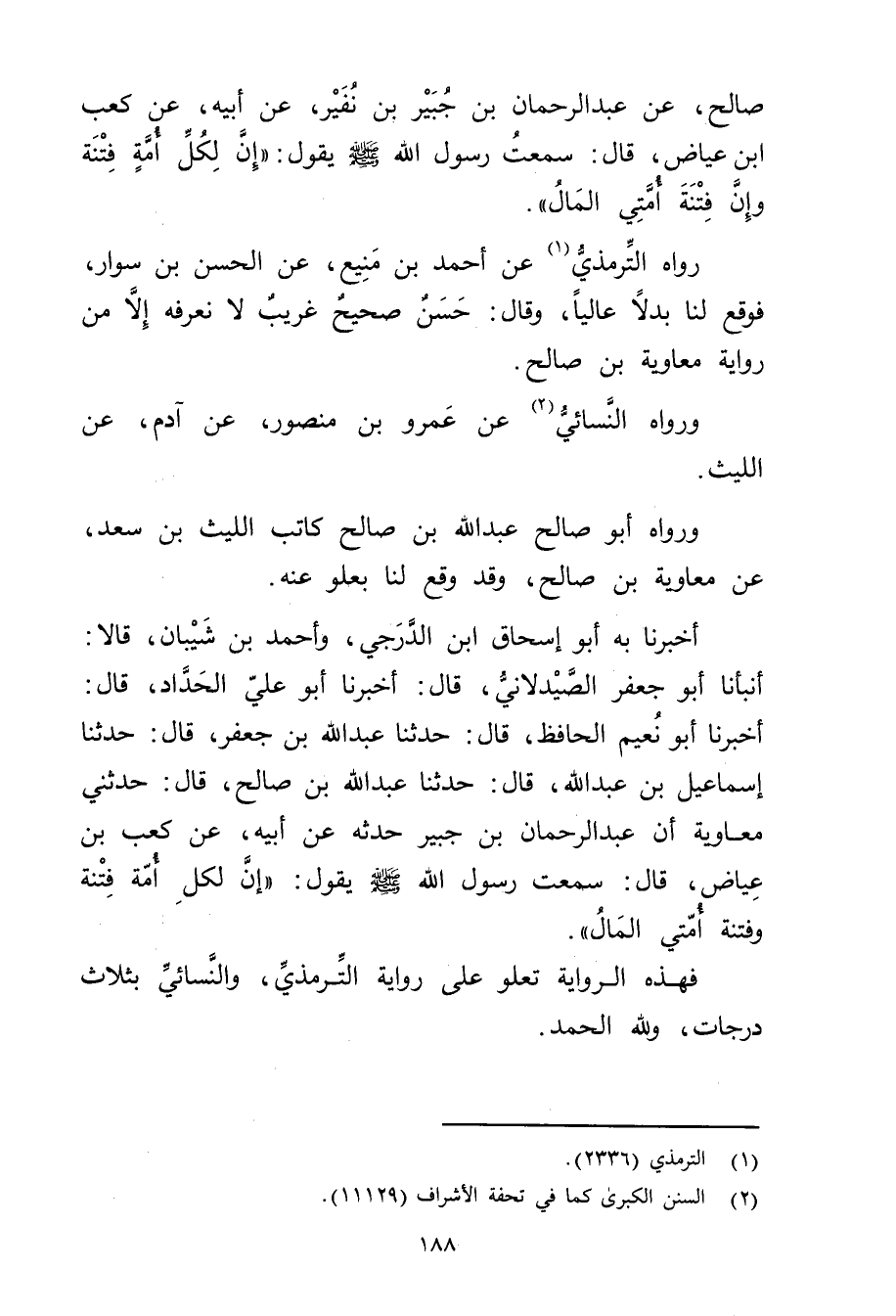 أَخْبَرَنَا بِهِ أَبُو إِسْحَاقَ ابْنُ الدَّرَجِيِّ، وأَحْمَدُ بْنُ شَيْبَانَ، قالا: أَنْبَأَنَا أَبُو جَعْفَرٍ الصَّيْدَلانِيُّ، قال: أَخْبَرَنَا أَبُو عَلِيّ الحداد، قال: أَخْبَرَنَا أَبُو نعيم الحافظ، قال: حَدَّثَنَا عَبد الله بْن جعفر، قال: حَدَّثَنَا إسماعيل بْن عَبد اللَّهِ، قال: حَدَّثَنَا عَبد اللَّهِ بْن صَالِحٍ، قال: حَدَّثَنِي مُعَاوِيَةُ أَنَّ عَبْدَ الرَّحْمَنِ بْنَ جُبَيْرٍ حَدَّثَهُ عَن أَبِيهِ، عَنْ كَعْبِ بْنِ عِيَاضٍ، قال: سَمِعْتُ رَسُولَ اللَّهِ صَلَّى اللَّهُ عَلَيْهِ وسَلَّمَ يقول: "إِنَّ لِكُلِّ أُمَّةٍ فِتْنَةً وفِتْنَةُ أُمَّتِي الْمَالُ.
