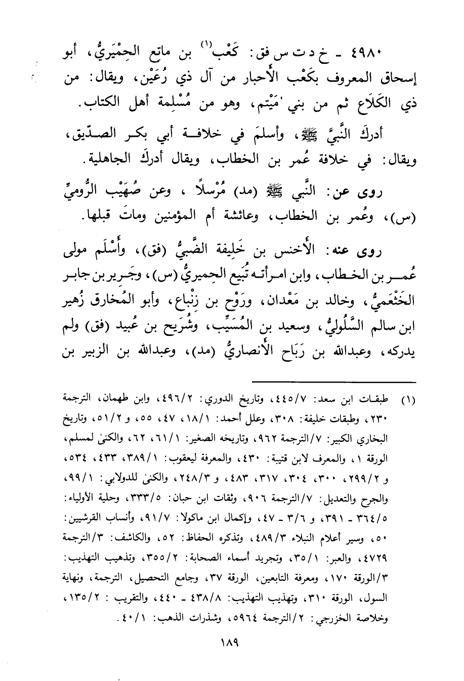 4980 - خ د ت س فق: كَعْب بن ماتع الحميري (1) ، أَبُو إِسْحَاق المعروف بكعب الأحبار من آل ذي رعين، ويُقال: من ذي الكلاع ثُمَّ من بني ميتم، وهو من مسلمة أهل الكتاب.