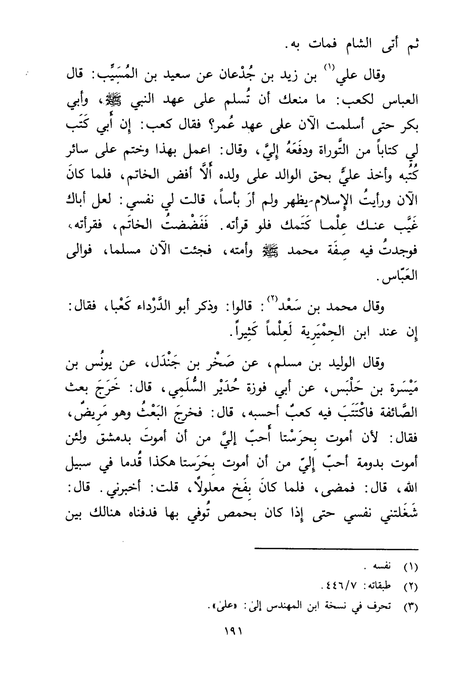 وَقَال علي (1) بْن زيد بْن جدعان عن سَعِيد بْن المُسَيَّب: قال الْعَبَّاس لكعب: مَا منعك أن تسلم على عهد النَّبِيّ صلى الله عليه وسلم، وأبي بَكْر حَتَّى أسلمت الآن على عهد عُمَر؟ فَقَالَ كَعْب: إن أَبِي كتب لي كتابا من التوراة ودفعه إلي، وَقَال: اعمل بهذا وختم على سائر