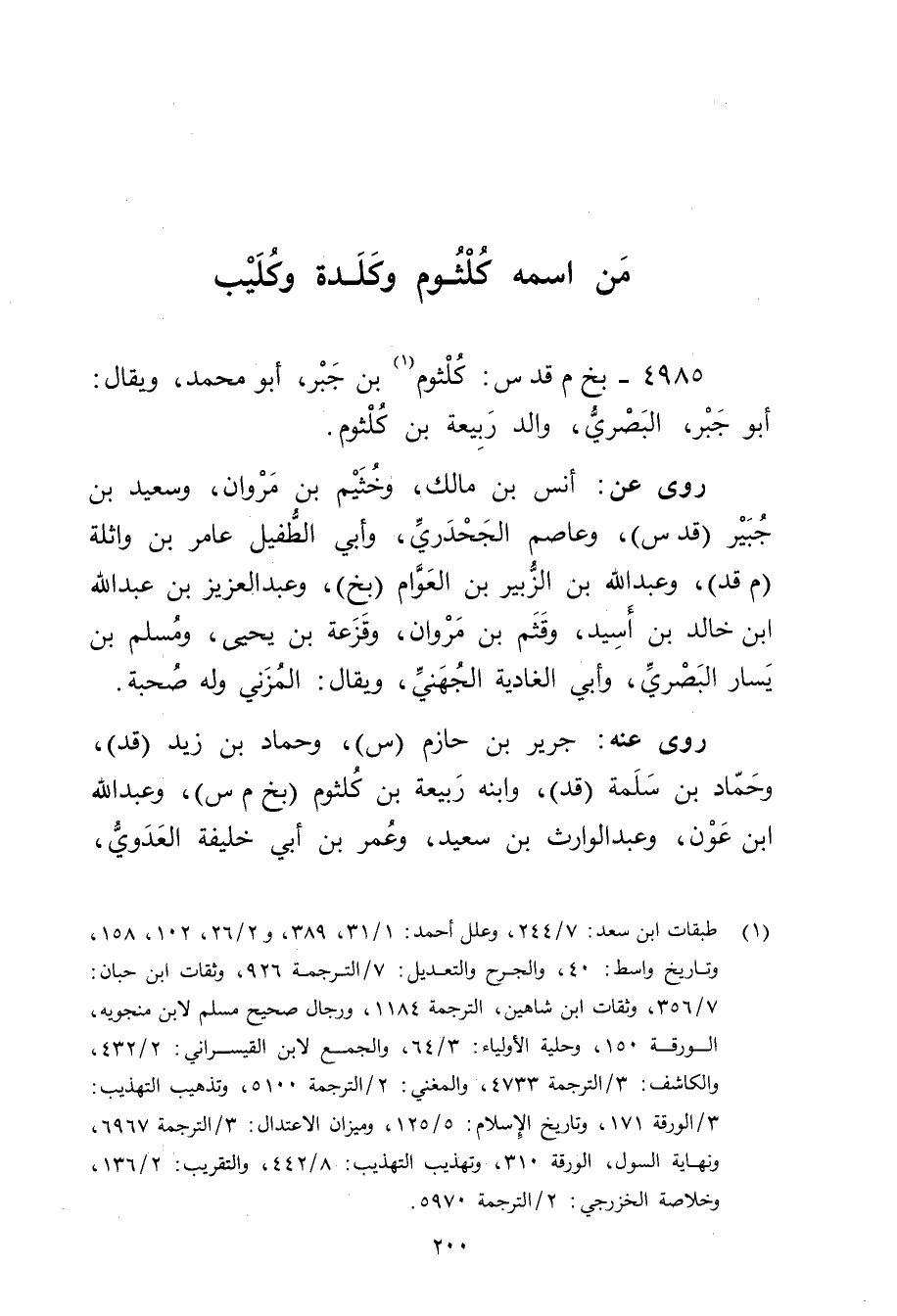 4985 - بخ م قد س: كلثوم بن جبر (1) ، أَبُو مُحَمَّد، ويُقال: أَبُو جبر، البَصْرِيّ، والد ربيعة بْن كلثوم.