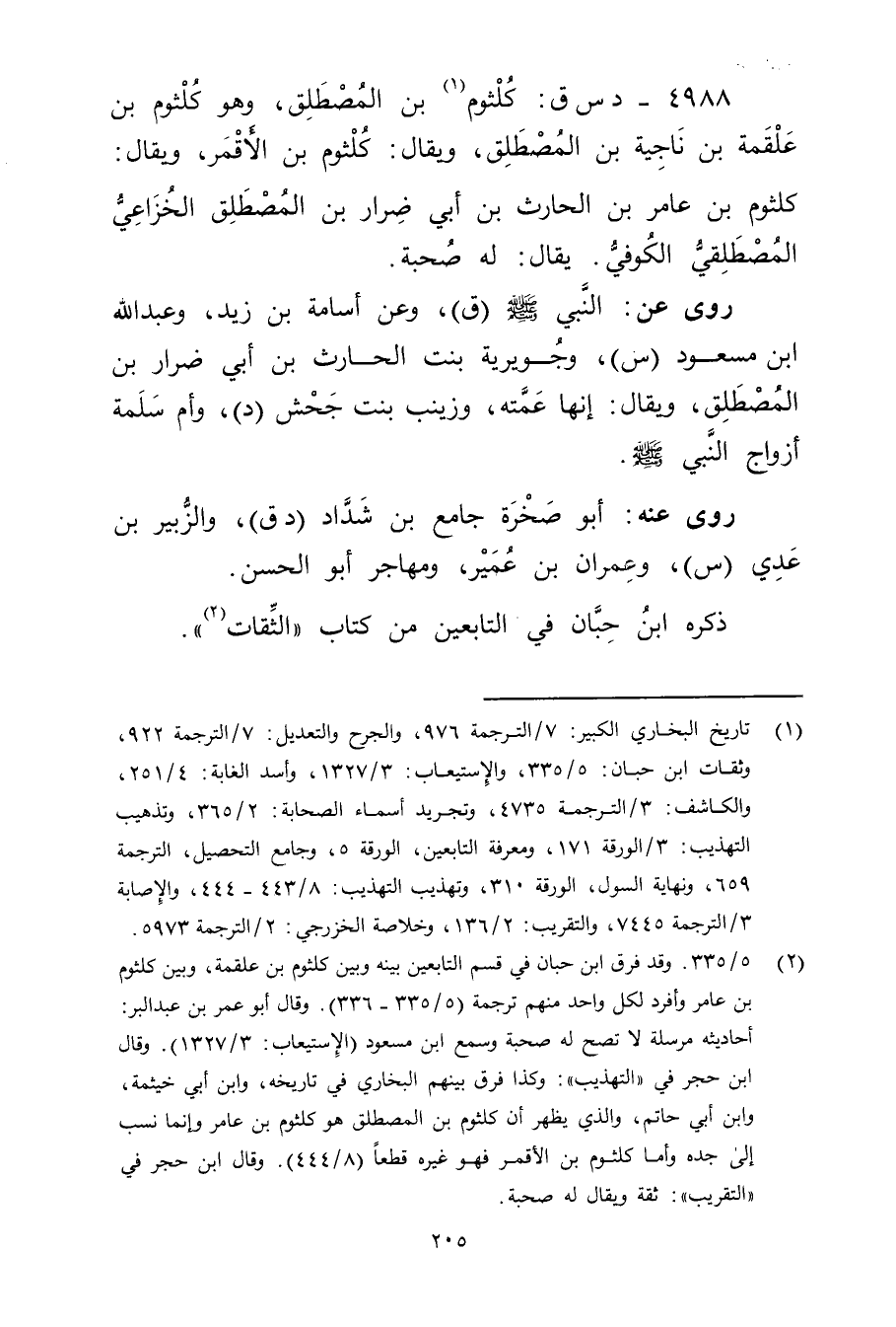 (2) 5 / 335. وقد فرق ابن حبان في قسم التابعين بينه وبين كلثوم بن علقمة، وبين كلثوم بن عامر وأفرد لكل واحد منهم ترجمة (5 / 335 - 336) . وَقَال أبو عُمَر بن عَبد الْبَرِّ: أحاديثه مرسلة لا تصح لهُ صُحبَةٌ وسمع ابن مسعود (الاستيعاب: 3 / 1327) . وَقَال ابن حجر في "التهذيب ": وكذا فرق بينهم البخاري في تاريخه، وابن أَبي خيثمة، وابن أَبي حاتم، والذي يظهر أن كلثوم بن المصطلق هو كلثوم بن عامر وإنما نسب إلى جَدِّه وأما كلثوم بن الاقمر فهو غيره قطعا (8 / 444) . وَقَال ابن حجر في "التقريب": ثقة ويُقال له صحبة.