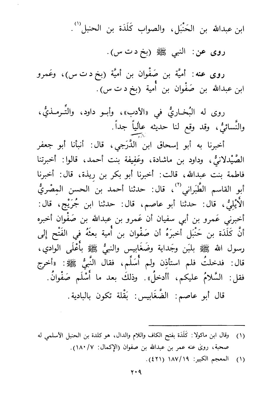 أَخْبَرَنَا بِهِ أَبُو إِسْحَاقَ ابْنُ الدَّرَجِيِّ، قال: أنبأنا أَبُو جَعْفَرٍ الصيدلاني، وداود بن ماشادة، وعفيفة بْنت أحمد، قَالُوا: أخبرتنا فَاطِمَةُ بِنْتُ عَبد اللَّهِ، قَالَتْ: أخبرنا أَبُو بَكْرِ بْنُ رِيذَةَ، قال: أخبرنا أَبُو الْقَاسِمِ الطَّبَرَانِيُّ (2) ، قال: حَدَّثَنَا أَحْمَدُ بْنُ الْحَسَنِ المِصْرِي الأَيْلِيُّ، قال: حَدَّثَنَا أَبُو عَاصِمٍ، قال: حَدَّثَنَا ابْنُ جُرَيْج، قال: أَخْبَرَنِي عَمْرو بْنُ أَبي سُفْيَانَ أَنَّ عَمْرو بْنَ عَبد اللَّهِ بْنِ صَفْوَانَ أَخْبَرَهُ أَنَّ كَلَدَةَ بْنَ حَنْبَلٍ أَخْبَرَهُ أَنَّ صَفْوَانَ بْنَ أُمَيَّةَ بَعَثَهُ فِي الْفَتْحِ إِلَى رَسُولِ اللَّهِ صلى الله عليه وسلم بِلَبَنٍ وجِدَايَةٍ وضَغَابِيسَ والنَّبِيُّ صلى الله عليه وسلم بِأَعْلَى الْوَادِي، قال: فَدَخَلْتُ فَلَمْ أَسْتَأْذِنْ ولَمْ أُسَلِّمْ، فَقَالَ النَّبِيُّ صلى الله عليه وسلم: "اخْرُجْ فَقُلِ: السَّلامُ عَلَيْكُمْ، أَأَدْخُلُ ". وذَلِكَ بَعْدَ مَا أَسْلَمَ صَفْوَانُ. قال أَبُو عَاصِمٍ: الضَّغَابِيسُ: بِقِلَّةٍ تكون بالبادية.
