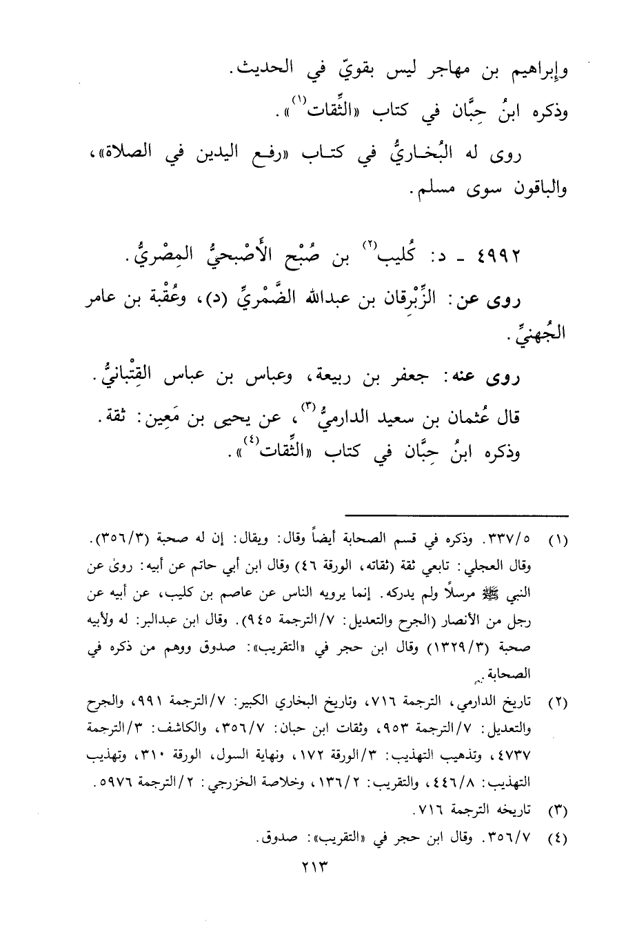 (2) تاريخ الدارمي، الترجمة 716، وتاريخ البخاري الكبير: 7 / الترجمة 991، والجرح والتعديل: 7 / الترجمة 953، وثقات ابن حبان: 7 / 356، والكاشف: 3 / الترجمة 4737، وتذهيب التهذيب: 3 / الورقة 172، ونهاية السول، الورقة 310، وتهذيب التهذيب: 8 / 446، والتقريب: 2 / 136، وخلاصة الخزرجي: 2 / الترجمة 5976.