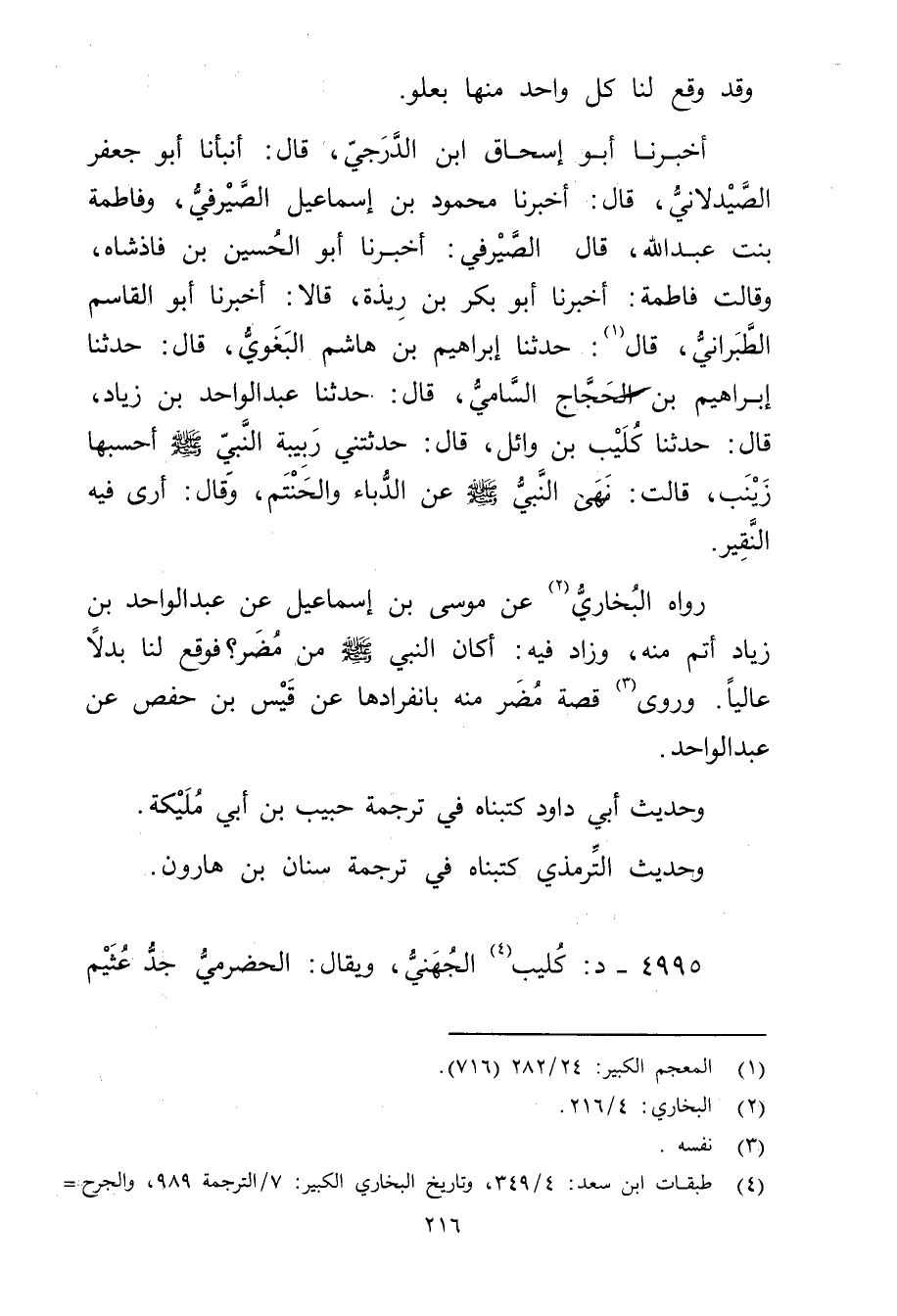 أخبرنا أَبُو إِسْحَاقَ ابْنُ الدَّرَجِيِّ، قال: أَنْبَأَنَا أَبُو جَعْفَرٍ الصَّيْدَلانِيُّ، قال: أَخْبَرَنَا مَحْمُودُ بْنُ إِسْمَاعِيلَ الصَّيْرَفِيُّ، وفَاطِمَةُ بِنْتُ عَبد اللَّهِ، قال الصَّيْرَفِيُّ: أَخْبَرَنَا أَبُو الْحُسَيْنِ بْنُ فَاذشَاهِ، وَقَالت فَاطِمَةُ: أخبرنا أَبُو بَكْرِ بْنُ رِيذَةَ، قَالا: أخبرنا أَبُو الْقَاسِمِ الطَّبَرَانِيِّ، قال (1) : حَدَّثَنَا إِبْرَاهِيمُ بْنُ هَاشِمٍ الْبَغَوِيُّ، قال: حَدَّثَنَا إِبْرَاهِيمُ بْن الحجاج السامي، قال: حَدَّثَنَا عَبْد الْوَاحِدِ بْن زِيَاد، قال: حَدَّثَنَا كُلَيْبُ بْنُ وائِلٍ، قال: حَدَّثَتْنِي رَبِيبَةُ النَّبِيِّ صلى الله عليه وسلم أَحْسَبُهَا زَيْنَبَ، قَالَتَ: نهى النَّبِيّ صَلَّى اللَّهُ عَلَيْهِ وسلم عَنِ الدُّبَّاءِ والْحَنْتَمِ، وَقَال: أَرَى فِيهِ النَّقِيرَ.