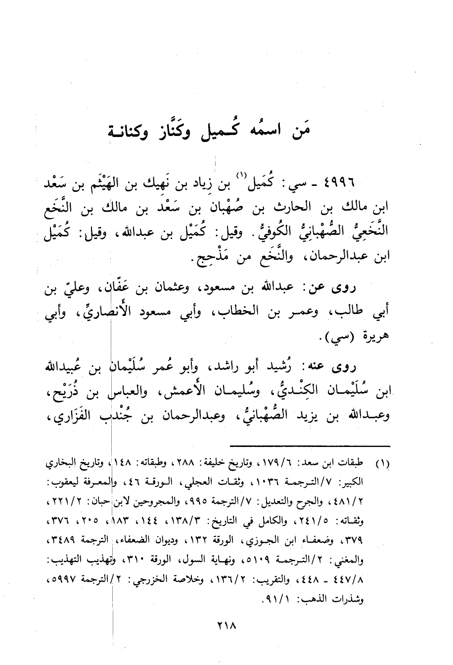 4996 - سي: كميل بن زِيَاد بن نهيك بن الهيثم بن سَعْد ابْن مالك بْن الحارث بْن صهبان بن سَعْد بن مَالِك بن النخع النخعي الصهباني الكوفي (1) .