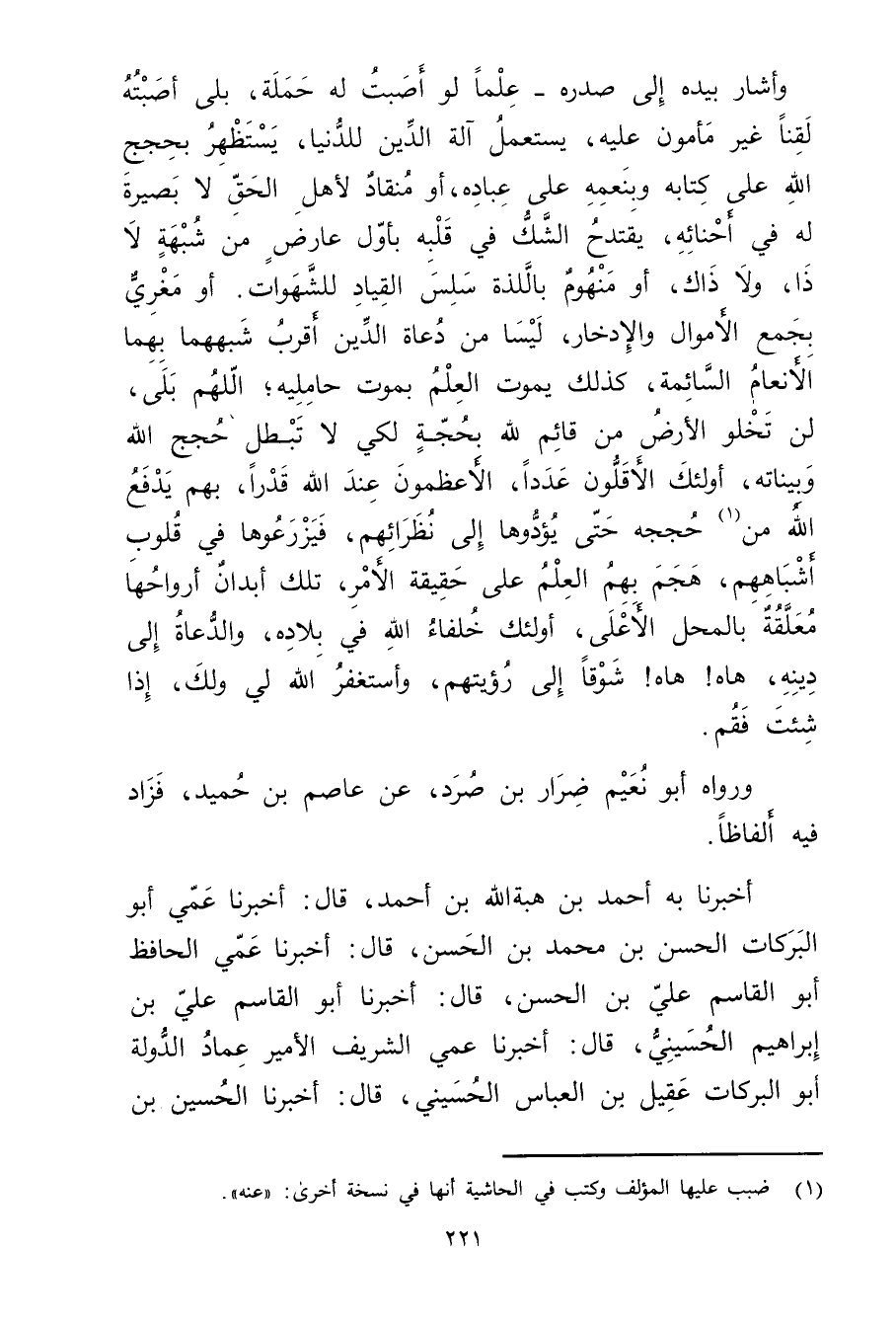 وأشار بيده إِلَى صدره - علما لو أصبت له حملة، بلى أصبته لقنا غَيْر مأمون عَلَيْهِ، يستعمل آلة الدين للدنيا، يستظهر بحجج الله على كتابه وبنعمه على عباده، أو منقاد لأهل الحق لا بصيرة له في أحنائه، يقتدح الشك في قلبه بأول عارض من شبهة لا ذا، ولا ذاك، أو منهوم باللذة سلس القياد للشهوات. أو مغري بجمع الأموال والإدخار، ليسا من دعاة الدين أقرب شبههما بِهِمَا الأنعام السائمة، كذلك يموت العلم بموت حامليه، اللهم بلى، لن تخلو الأرض من قائم لله بحجة لكي لا تبطل حجج الله وبيناته، أولئك الأقلون عدداً، الأعظمون عند الله قدرا، بهم يدفع الله من (1) حججه حَتَّى يؤدوها إِلَى نظرائهم، فيزرعوها في قلوب أشباههم، هجم بهم العلم على حقيقة الأمر، تلك أبدان أرواحها معلقة بالمحل الأعلى، أولئك خلفاء الله في بلاده، والدعاة إِلَى دينه، هاه! هاه! شوقا إِلَى رؤيتهم، وأستغفر الله لي ولك، إذا شئت فقم.