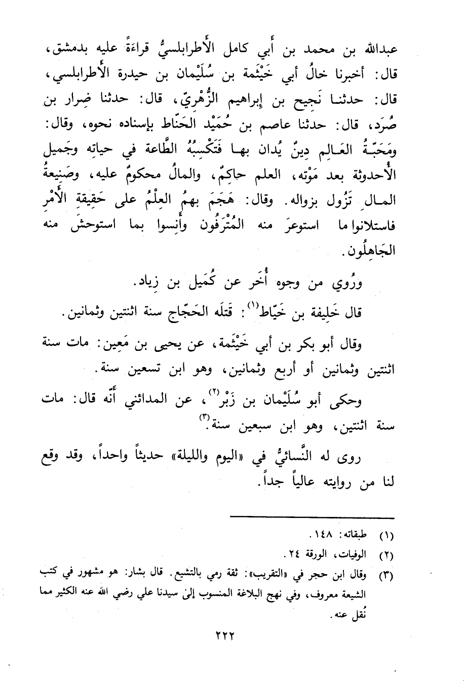 عَبد اللَّهِ بْن مُحَمَّد بْن أَبي كامل الأطرابلسي قِرَاءَةً عَلَيْهِ بِدِمَشْقَ، قال: أَخْبَرَنَا خال أَبِي خَيْثَمَة بْن سُلَيْمان بْن حيدرة الأطرابلسي، قال: حَدَّثَنَا نَجِيح بْن إِبْرَاهِيم الزُّهْرِيّ، قال: حَدَّثَنَا ضرار بْن صرد، قال: حَدَّثَنَا عَاصِم بْن حُمَيْد الحناط بإسناده نحوه، وَقَال: ومحبة العالم دين يدان بها فتكسبه الطاعة في حياته وجميل الأحدوثة بعد موته، العلم حاكم، والمال محكوم عَلَيْهِ، وصنيعة المال تزول بزواله. وَقَال: هجم بهم العلم على حقيقة الأمر فاستلانوا مَا استوعر منه المترفون وأنسوا بما استوحش منه الجاهلون.