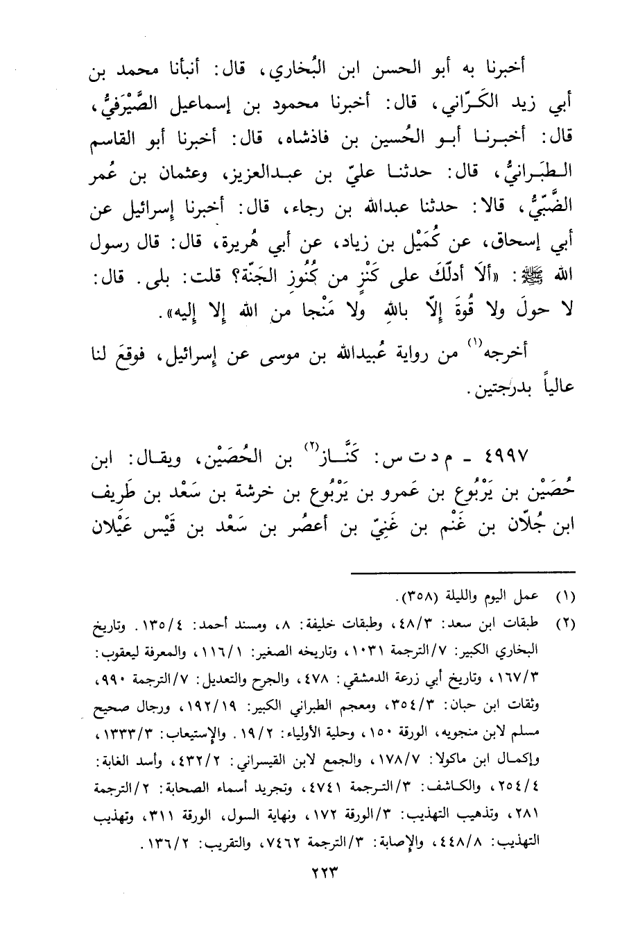 أخبرنا بِهِ أَبُو الْحَسَنِ بْنُ الْبُخَارِيِّ، قال: أَنْبَأَنَا مُحَمَّدُ بْنُ أَبي زَيْدٍ الْكَرَّانِيُّ، قال: أَخْبَرَنَا مَحْمُودُ بْنُ إِسْمَاعِيلَ الصَّيْرَفِيُّ، قال: أَخْبَرَنَا أَبُو الْحُسَيْنِ بْنُ فَاذْشَاهِ، قال: أخبرنا أَبُو الْقَاسِمِ الطَّبَرَانِيُّ، قال: حَدَّثَنَا علي بْن عبد الْعَزِيَزِ، وعُثْمَانُ بْنُ عُمَر الضَّبِّيُّ، قالا: حَدَّثَنَا عَبد اللَّهِ بْنُ رَجَاءٍ، قال: أَخْبَرَنَا إِسْرَائِيلُ عَن أَبِي إِسْحَاقَ، عَنْ كُمَيْلِ بْنِ زِيَادٍ، عَن أَبِي هُرَيْرة، قال: قال رَسُولُ اللَّهِ صلى الله عليه وسلم: "أَلا أَدُلُّكَ عَلَى كَنْزٍ مِنْ كُنُوزِ الْجَنَّةِ؟ قُلْتُ: بلى. قال: لاحول ولا قُوَّةَ إِلا بِاللَّهِ ولا مَنْجَا مِنَ اللَّهِ إِلا إِلَيْهِ.