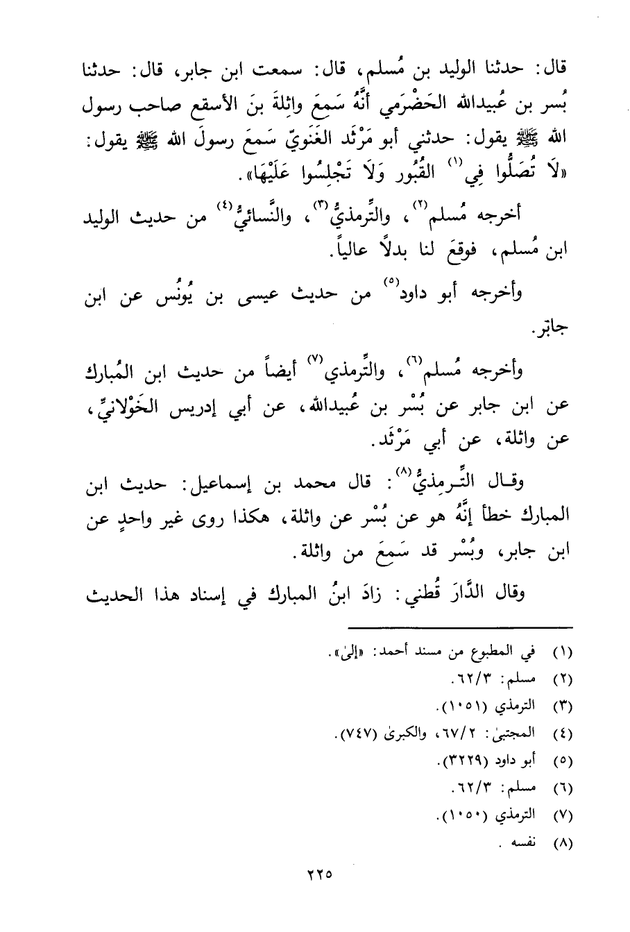 وأخرجه مُسْلِم (6) ، والتِّرْمِذِيّ (7) أيضا من حديث ابن المبارك عَنْ ابْن جَابِر عَنْ بسر بْن عُبَيد اللَّهِ، عَن أَبِي إِدْرِيسَ الخولاني، عَنْ واثلة، عَن أَبِي مرثد.