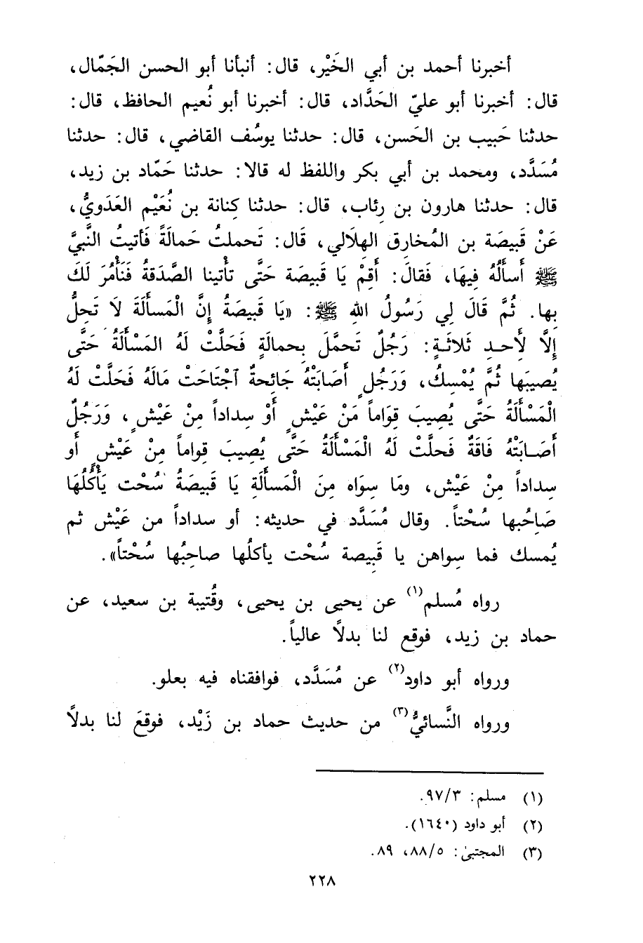 قال: حَدَّثَنَا هَارُونُ بْنُ رِئَابٍ، قال: حَدَّثَنَا كِنَانَةُ بْنُ نُعَيْمٍ الْعَدَوِيُّ، عَنْ قَبِيصَةَ بْنِ الْمُخَارِقِ الْهِلالِيِّ، قال: تَحَمَّلْتُ حَمَالَةً فَأَتَيْتُ النَّبِيَّ صلى الله عليه وسلم أسأله فيها، فَقَالَ: أَقِمْ يَا قَبِيصَةُ حَتَّى تَأْتِيَنَا الصَّدَقَةُ فَنَأْمُرُ لَكَ بِهَا. ثُمَّ قال لِي رَسُولُ اللَّهِ صَلَّى اللَّهُ عَلَيْهِ وسَلَّمَ: "يَا قَبِيصَةَ إِنَّ الْمَسْأَلَةَ لا تَحِلُّ إِلا لأَحَدِ ثَلاثَةٍ: رَجُلٌ تَحَمَّلَ بِحَمَالَةٍ فَحَلَّتْ لَهُ الْمَسْأَلَةُ حَتَّى يُصِيبَهَا ثُمَّ يُمْسِكُ، ورَجُلٌ أَصَابَتْهُ جَائِحَةٌ اجْتَاحَتْ مَالَهُ فَحَلَّتْ لَهُ الْمَسْأَلَةُ حَتَّى يُصِيبَ قِوَامًا مِنْ عَيْشٍ أَوْ سَدَادًا مِنْ عَيْشٍ، ورجل أصابته فاقة تحلت لَهُ الْمَسْأَلَةُ حَتَّى يُصِيبَ قِوَامًا مِنْ عَيْشٍ أَوْ سَدَادًا مِنْ عَيْشٍ، ومَا سِوَاهُ مِنَ الْمَسْأَلَةِ يَا قَبِيصَةُ سُحْتٌ يَأْكُلُهَا صَاحِبُهَا سُحْتًا.