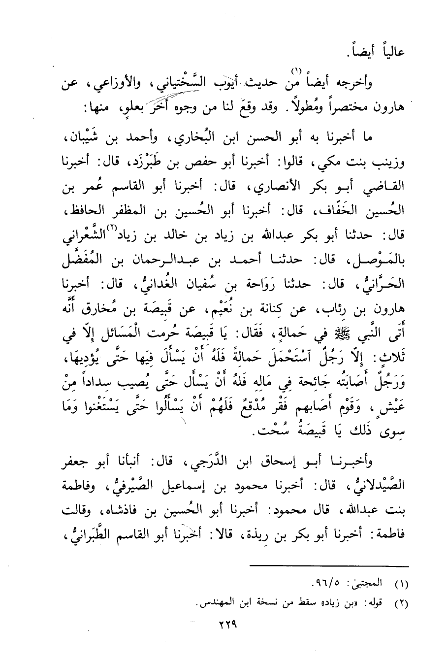 ما أَخْبَرَنَا بِهِ أَبُو الْحَسَنِ بْنُ الْبُخَارِيِّ، وأحمد بْن شَيْبَانَ، وزَيْنَبُ بِنْتُ مَكِّيٍّ، قَالُوا: أخبرنا أبو حفص بن طَبَرْزَذَ، قال: أخبرنا الْقَاضِي أَبُو بَكْرٍ الأَنْصارِيّ، قال: أَخْبَرَنَا أَبُو الْقَاسِمِ عُمَر بْنُ الْحُسَيْنِ الْخَفَّافُ، قال: أَخْبَرَنَا أَبُو الْحُسَيْنِ بْنُ الْمُظَفَّرِ الْحَافِظُ، قال: حَدَّثَنَا أَبُو بَكْر عَبد اللَّهِ بن زياد بن خَالِدِ بْنِ زِيَادٍ (2) الشَّعْرَانِيُّ بِالْمَوْصِلِ، قال: حَدَّثَنَا أَحْمَدُ بْنُ عَبْدِ الرَّحْمَنِ بْنِ الْمُفَضَّلِ الْحَرَّانِيُّ، قال: حَدَّثَنَا رَوَاحَةُ بْنُ سُفْيَانَ الْغُدَانِيُّ، قال: أخبرنا هَارُونُ بْنُ رِئَابٍ، عَنْ كِنَانَةَ بْنِ نُعَيْمٍ، عَنْ قَبِيصَةَ بْنِ مُخَارِقٍ أَنَّهُ أَتَى النَّبِيُّ صلى الله عليه وسلم فِي حَمَالَةٍ، فَقَالَ: يَا قَبِيصَةُ حُرِّمَتِ الْمَسَائِلُ إِلا فِي ثَلاثٍ: إِلا رَجُلٌ اسْتَحْمَلَ حَمَالَةً فَلَهُ أَنْ يَسْأَلَ فِيهَا حَتَّى يُؤَدِّيَهَا، ورَجُلٌ أَصَابَتْهُ جَائِحَةٌ فِي مَالِهِ فَلَهُ أَنْ يَسْأَلَ حَتَّى يُصِيبَ سَدَادًا مِنْ عَيْشٍ، وقَوْمٌ أَصَابَهُمْ فَقْرٌ مُدْقِعٌ فَلَهُمْ أَنْ يَسْأَلُوا حَتَّى يَسْتَغْنُوا ومَا سِوَى ذَلِكَ يَا قَبِيصَةُ سُحْتٌ.