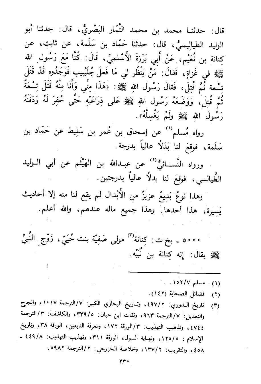قال: حَدَّثَنَا مُحَمَّد بْن مُحَمَّد التَّمَّارُ البَصْرِيّ، قال: حَدَّثَنَا أَبُو الوليد الطَّيَالِسِيُّ، قال: حَدَّثَنَا حَمَّادُ بْنُ سَلَمَةَ، عَنْ ثَابِتٍ، عَنْ كِنَانَةَ بْنِ نُعَيْمٍ، عَن أَبِي بَرَزَةَ الأَسلميّ، قال: كُنَّا مَعَ رَسُولِ اللَّهِ صلى الله عليه وسلم فِي غَزَاةٍ، فَقَالَ: مَنْ يَنْظُرُ لِي مَا فَعَلَ جُلَيْبِيبٌ فَوَجَدُوهُ قَدْ قَتَلَ تِسْعَةً ثُمَّ قُتِلَ، فَقَالَ رَسُولُ اللَّهِ صلى الله عليه وسلم: "هَذَا مِنِّي وأَنَا مِنْهُ قَتَلَ تِسْعَةً ثُمَّ قُتِلَ، ووَضَعَهُ رَسُولُ اللَّهِ صلى الله عليه وسلم عَلَى ذِرَاعَيْهِ حَتَّى حُفِرَ لَهُ ودَفَنَهُ رَسُولُ اللَّهِ صَلَّى اللَّهُ عليه وسلم ولم يُغَسِّلْهُ.