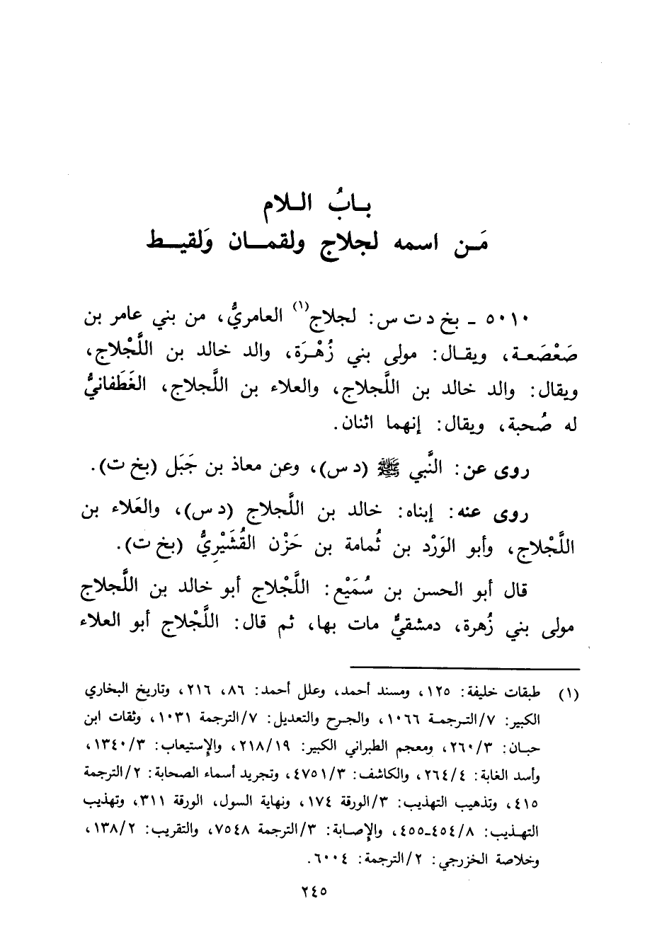 5010 - بخ د ت س: لجلاج العامري (1) ، من بني عَامِر بْن صعصعة، ويُقال: مولى بني زهرة، والد خَالِد بْن اللجلاج، ويُقال: والد خَالِد بْن اللجلاج، والعلاء بْن اللجلاج، الغطفاني لهُ صُحبَةٌ، ويُقال: إنهما اثنان.