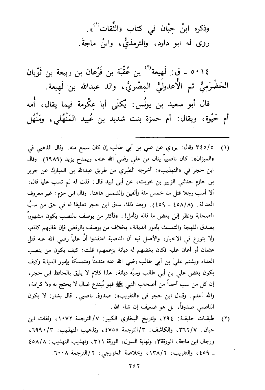 (2) طبقات خليفة: 294، وتاريخ البخاري الكبير: 7 / الترجمة 1072، وثقات ابن حبان: 7 / 362، والكاشف: 3 / الترجمة 4755، وتذهيب التهذيب: 3 / 6990، ورجال ابن ماجة، الورقة 3، ونهاية السول، الورقة 311، وتهذيب التهذيب: 8 / 458 - 459، والتقريب: 2 / 138، وخلاصة الخزرجي: 2 / الترجمة 6008.