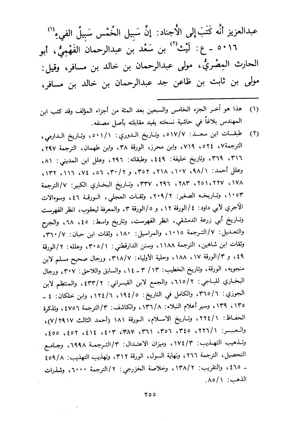 5016 - ع: لَيْث بن سَعْد بن عَبْد الرَّحْمَنِ الفهمي (2) ، أَبُو الْحَارِث المِصْرِي، مولى عبد الرحمن بْن خَالِد بْن مسافر، وقيل: مولى بن ثَابِت بْن ظاعن جد عَبْد الرَّحْمَنِ بْنِ خَالِدِ بْنِ مُسَافِرٍ،