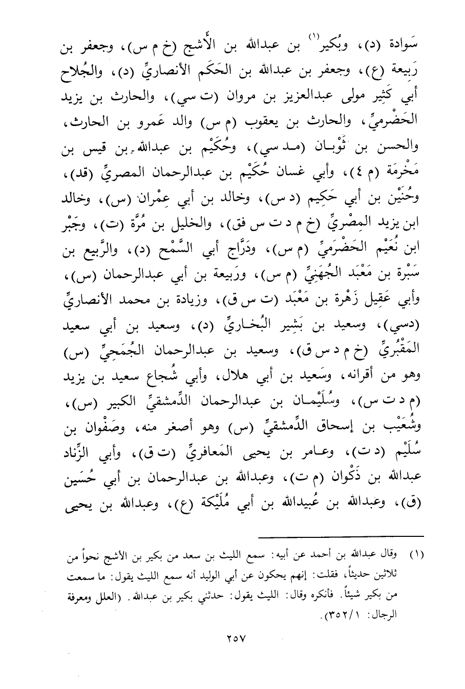 (1) وَقَال عَبد اللَّهِ بن أحمد عَن أبيه: سمع الليث بن سعد من بكير بن الاشج نحوا من ثلاثين حديثًا، فقلت: إنهم يحكون عَن أبي الوليد أنه سمع الليث يقول: ما سمعت من بكير شيئا.