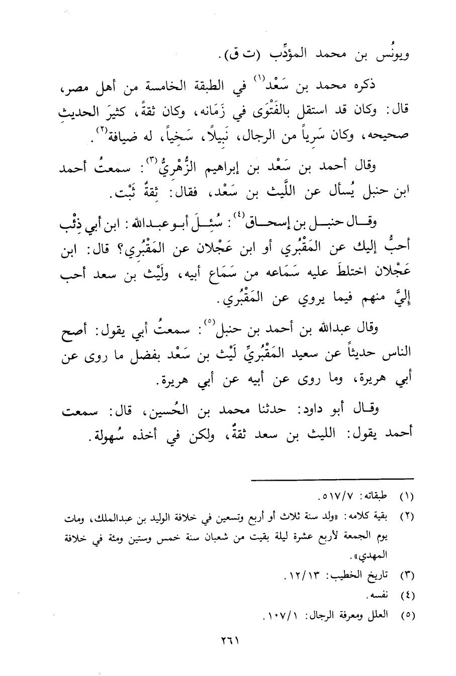 (2) بقية كلامه: "ولد سنة ثلاث أو أربع وتسعين في خلافة الوليد بْن عَبد المَلِك، ومات يوم الجمعة لأربع عشرة ليلة بقيت من شعبان سنة خمس وستين ومئة في خلافة المهدي.