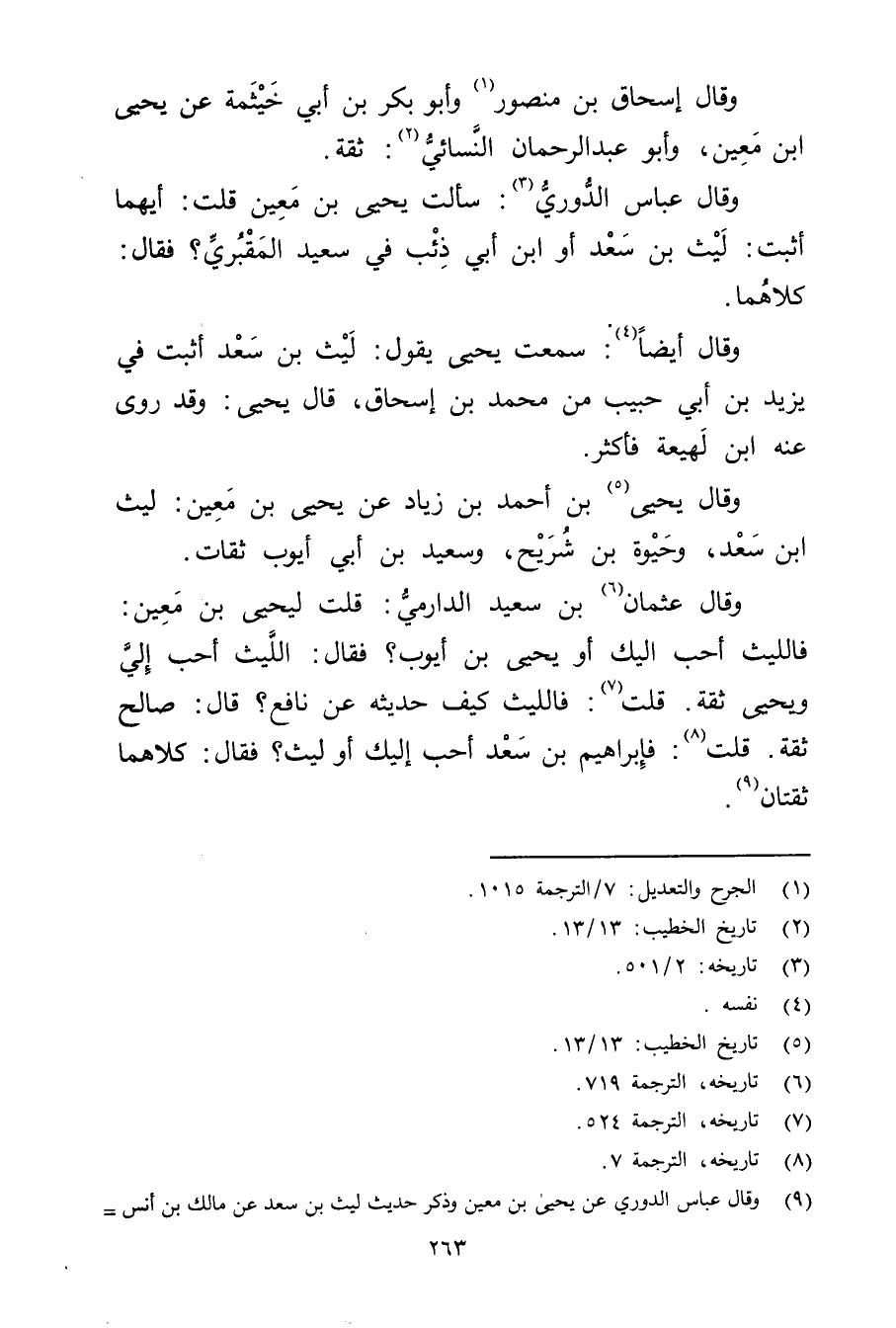 وَقَال عَباس الدُّورِيُّ (3) : سألت يَحْيَى بْن مَعِين قلت: أيهما أثبت: لَيْث بْن سَعْد أو ابْن أَبي ذئب في سَعِيد المقبري؟ فَقَالَ: كلاهما.