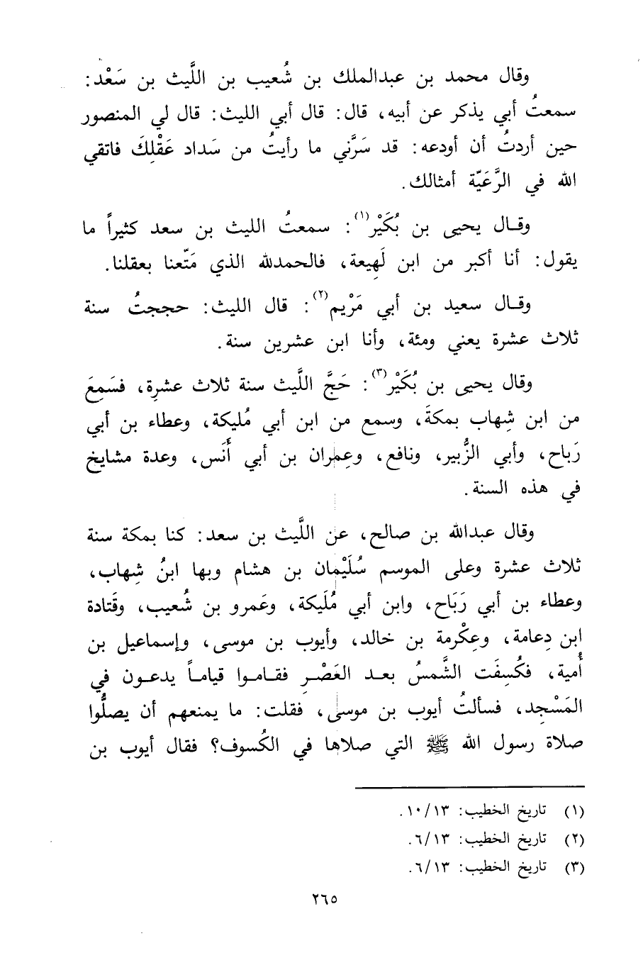 وَقَال عَبد اللَّهِ بْنِ صَالِحٍ، عَنْ اللَّيْث بْن سَعْد: كنا بمكة سنة ثلاث عشرة وعلى الموسم سلميان بن هشام وبها ابن شهاب، وعطاء بْن أَبي رباح، وابْن أَبي مليكة، وعَمْرو بْن شعيب، وقتادة ابن دعامة، وعكرمة بْن خَالِد، وأيوب بْن موسى، وإسماعيل بْن أمية، فكسفت الشمس بعد العصر فقاموا قياما يدعون في المسجد، فسألت أَيُّوب بْن مُوسَى، فقلت: مَا يمنعهم أن يصلوا صلاة رَسُول اللَّهِ صلى الله عليه وسلم التي صلاها في الكسوف؟ فَقَالَ أيوب بْن
